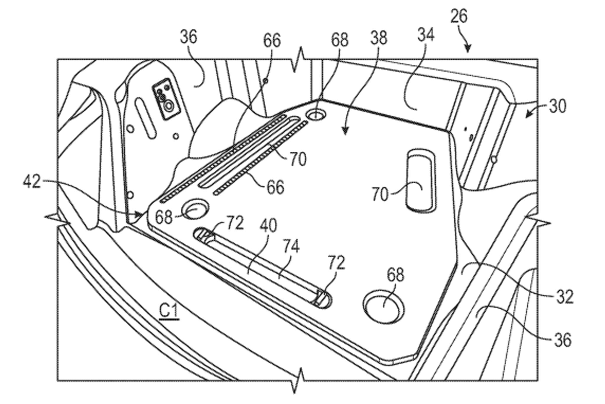 The table in the patent is interesting as well. Shaped to match the size and shape of the trunk, it appears to pivot out on a hinge and then support itself from below with a fold-out panel. This panel latches onto a spot somewhere near the front license plate. Plainly visible are a series of cupholders and a few slots to retain other items.