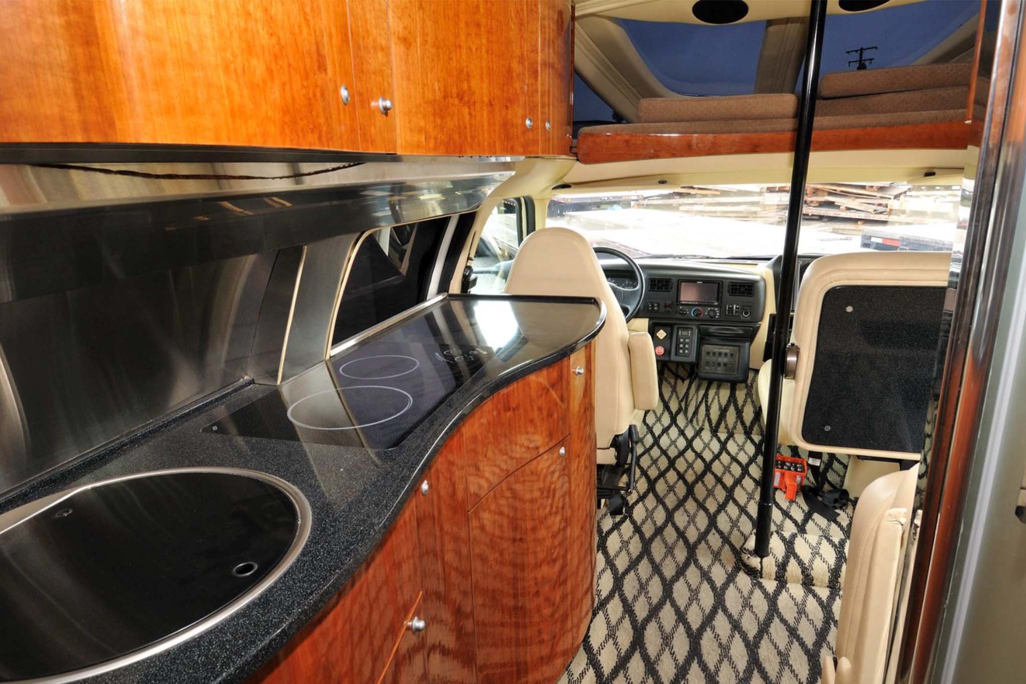 If anything, that’s just an added bonus given all the luxury living features inside the rig. When the carpet’s diamond pattern matches the quilted leather seats, you know you’re in for a good time. The passenger-rear door reveals a step that’s similar to what you’d find on a city bus, maybe because this is about the same size as one. What a city bus doesn’t have, though, are full sleeping quarters, a bathroom with a shower that provides instant hot water without propane, a sink, a stove, and a living room with a flatscreen TV as the centerpiece.