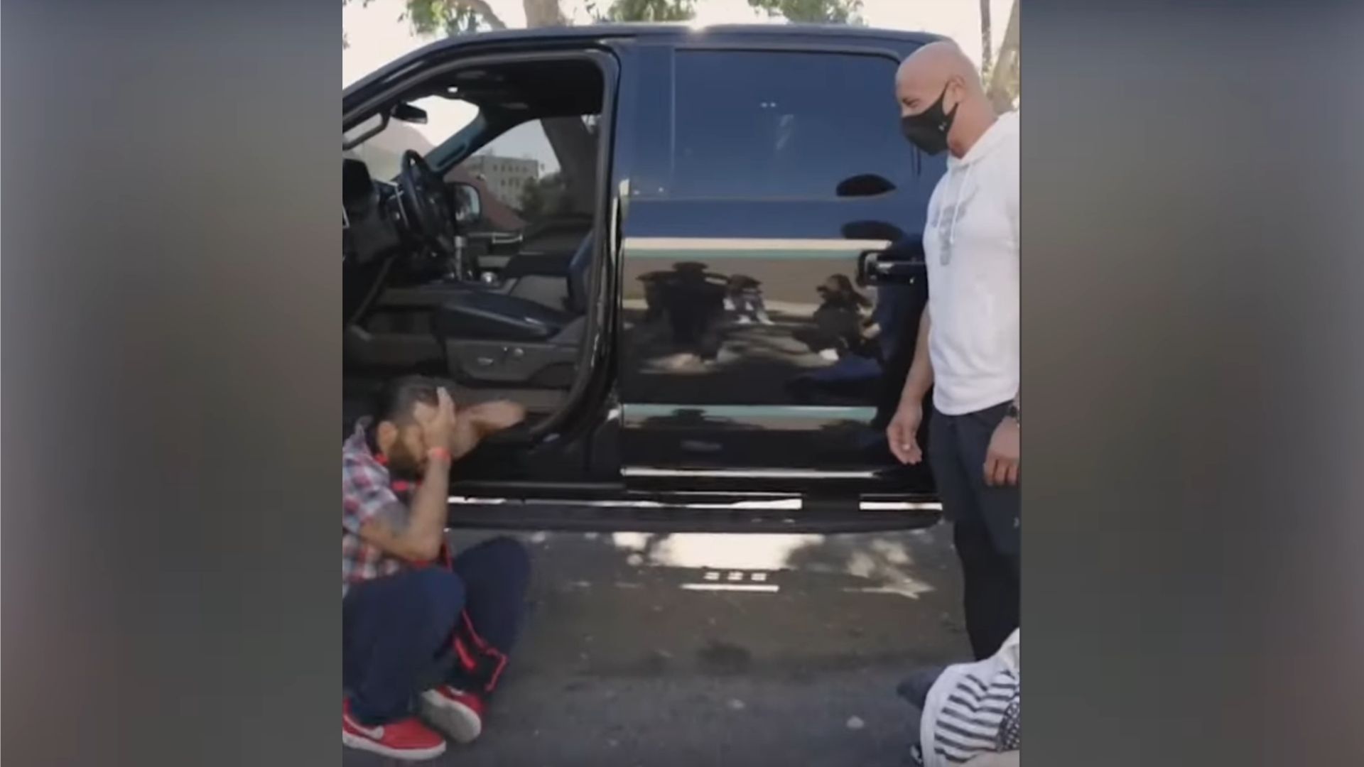 In an emotional and touching video, Johnson calls Rodriguez up to the stage at the screening and highlights all of the good things the Navy veteran does for others. Then he brings Rodriguez outside, where he opens the door of his truck and hands the fan a hand-written note that read “thank you for your service, brother. Enjoy your new truck.”