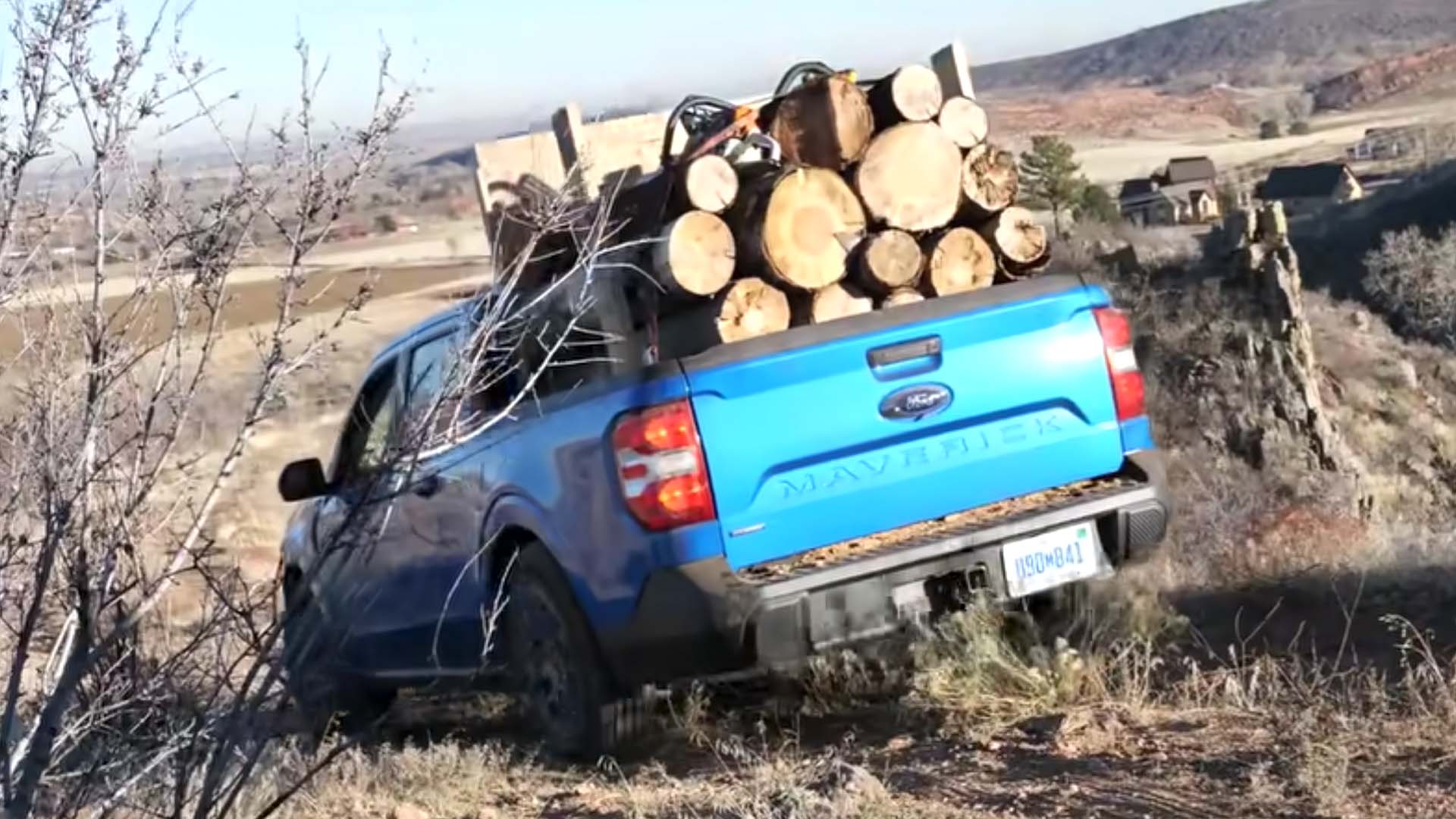 I was able to test the Maverick back in September, and even the 191-horsepower hybrid model had no problems zipping up the Tennessee hills with a pallet of mulch in the bed. The TFL Truck crew has taken it a step further, though, by mounding a load of logs back there and driving it on dirt and gravel ranch trails. As you’ll see, that didn’t bother the Maverick, either.