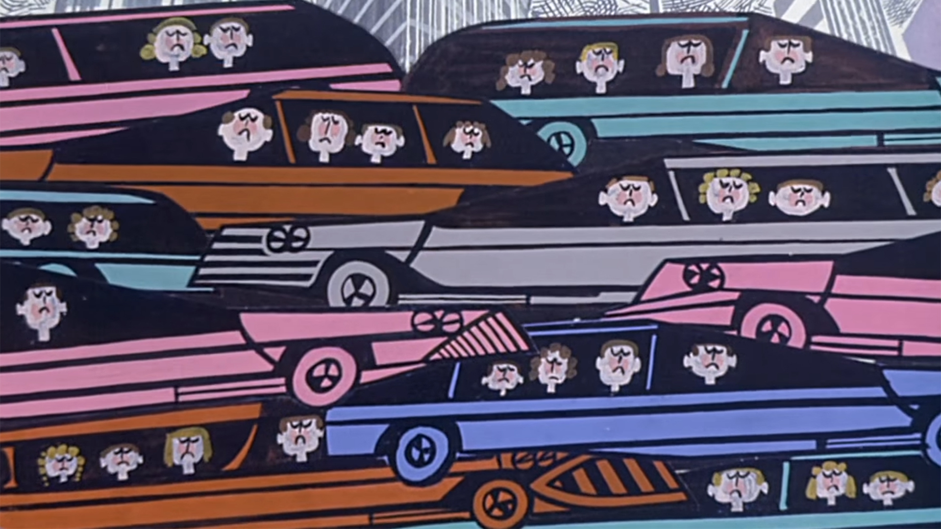 At the center of the exhibition is the 1963 Oscar-nominated short Automania, from which the exhibition derives its title. The satirical cartoon imagines a world where scientists create automobiles that meet the public’s absurd consumer demands. The cars are faster and bigger and ever more specific until they fill garages like shirts in a closet and the streets are so crowded that the basic function of the automobile, movement, is rendered impossible. By the end of the short, people are living in their cars and all their wants from liquor to healthcare are delivered to them by helicopter.