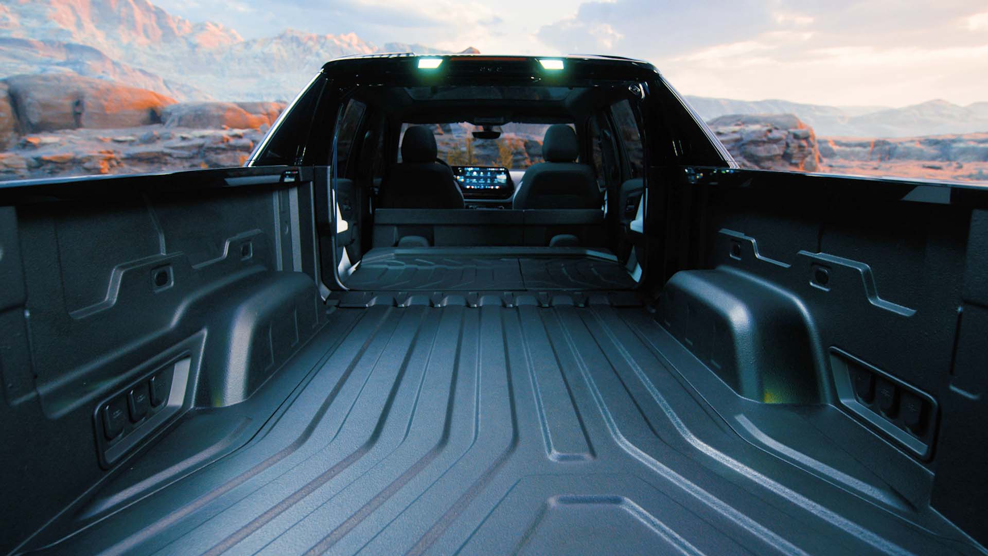 Chevy didn’t provide any photos of this tonneau cover, however, you’ll notice the bed is packed with power outlets. Another thing to mention is that these cargo specs don’t even mention the front storage area—the frunk. The volume of this front storage area was not specified, however, it looks roughly similar in size to the Lightning’s.