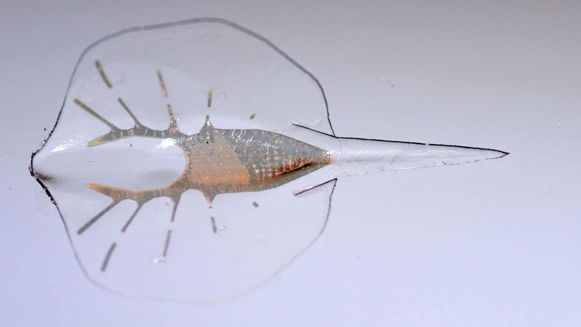 About 0.6 inches long and weighing in at a mere four ounces, the robo-ray is made up of three ingredients: a flexible gold skeleton with ribs, layers of transparent silicon (the same type used in breast implants) molded in the shape of an ocean ray, and 200,000 living muscle cells from a rat’s heart. The bottom silicon layer is etched with two serpentine patterns that form geometric S-shapes on either side of the robe-ray’s spine; these run from the center to the edge of the fins and from the nose to the tail. The rat cells are laid into the pattern on either side of the gold spine; they then stitch themselves together to form an S-shaped line of muscle. Then the top layer of silicon seals the system.