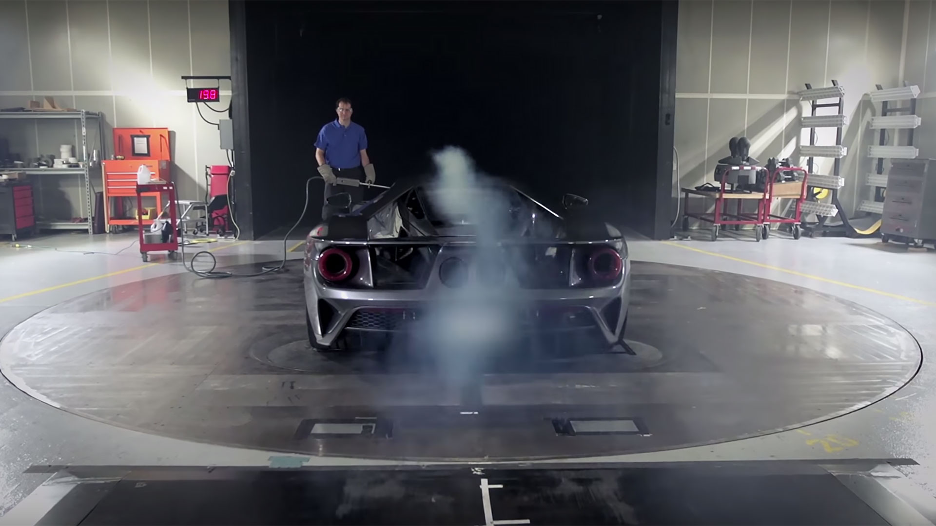 As Ford is all too happy to point out, all those scoops, vents, and intakes weren’t added to the GT in a Homer Simpson-like attempt to add speed holes; every curve, bulge, and hollow of the car’s exterior serve a specific aerodynamic purpose. To see how they all come together to keep the Ford GT stuck to the ground at super-legal speeds, Ford subjected the car to wind speeds of nearly 125 miles per hour in the wind tunnel, giving engineers a chance to watch firsthand the ways the fast-moving air flows and dances over the car’s transforming spoiler and whale shark-like front vents.