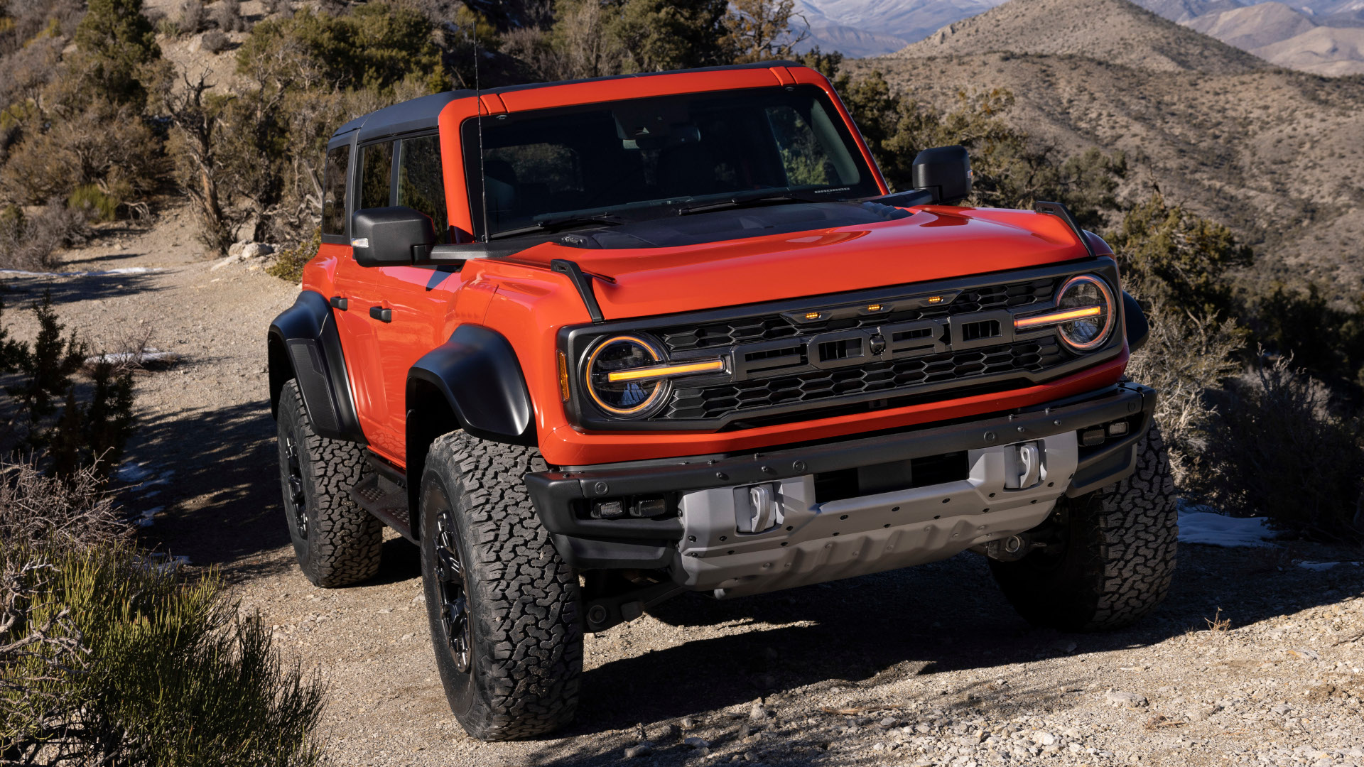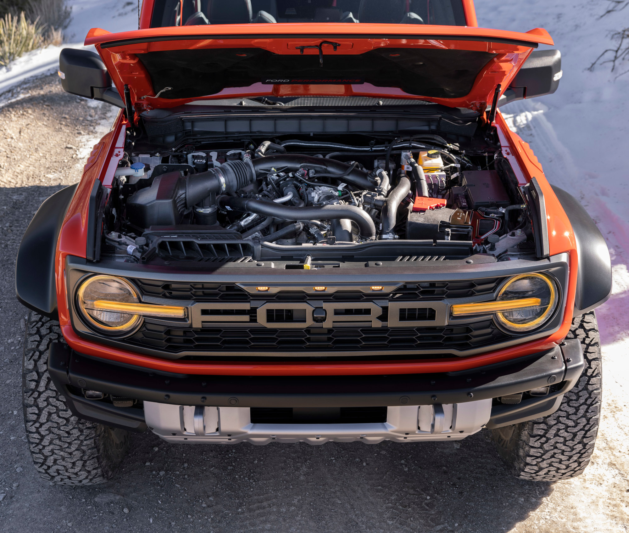 Straight away, the Raptor variant is the most powerful street-legal production Bronco ever. You’d expect that, of course, and the rig’s “more than 400” horsepower is produced by a 3.0-liter twin-turbo EcoBoost V6. Tweaks have been made to this lump, which also appears in the Explorer ST, to help reduce induction losses. Ford then adds that it’s taken the proper cooling measures to keep the truck going in high ambient temperatures. A 10-speed automatic handles the output from there, and a true dual exhaust system with active valving uses near-equal length pipes to let desert critters know you’re coming through.