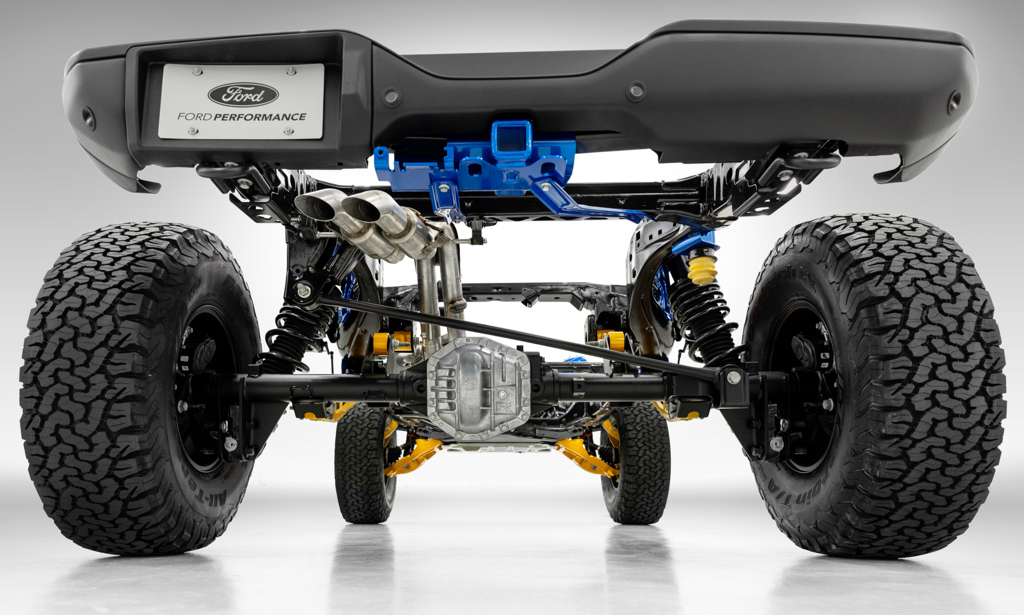 Also to better handle fast-paced desert driving, the Bronco’s frame has been strengthened. The fully-boxed steel base has new front and rear shock towers for better durability and increased wheel travel, while there have been further improvements made to the B-pillar crossbar and the C-pillar. The Raptor apparently totes a 50 percent increase in torsional rigidity over the base model, and the suspension is a whole lot more complex, too.