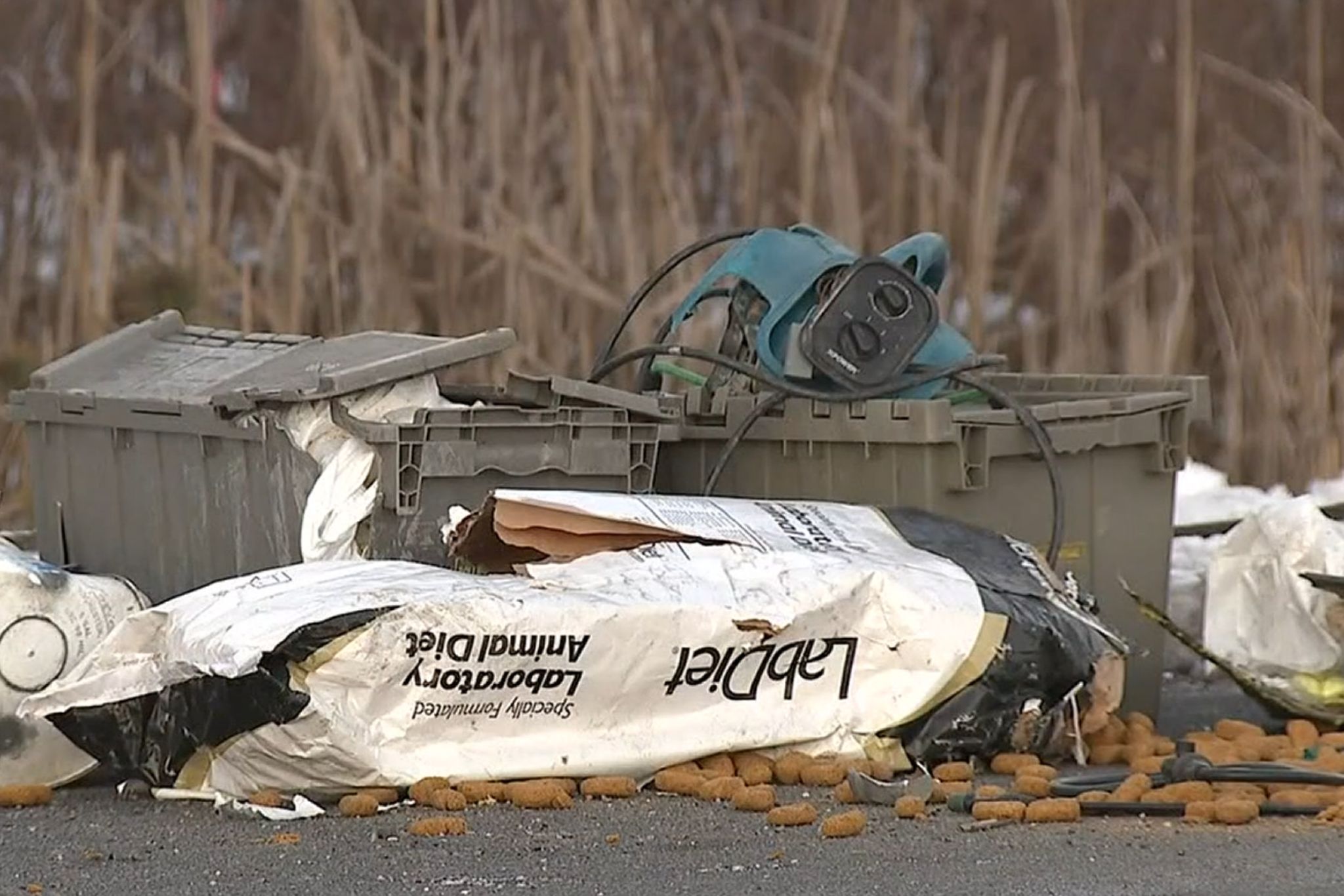 Reports vary, but out of 100 monkeys, about a handful made their escape. In photos, broken LabDiet animal feed bags litter the highway and crates labeled “live animals” are scattered randomly across the scene.