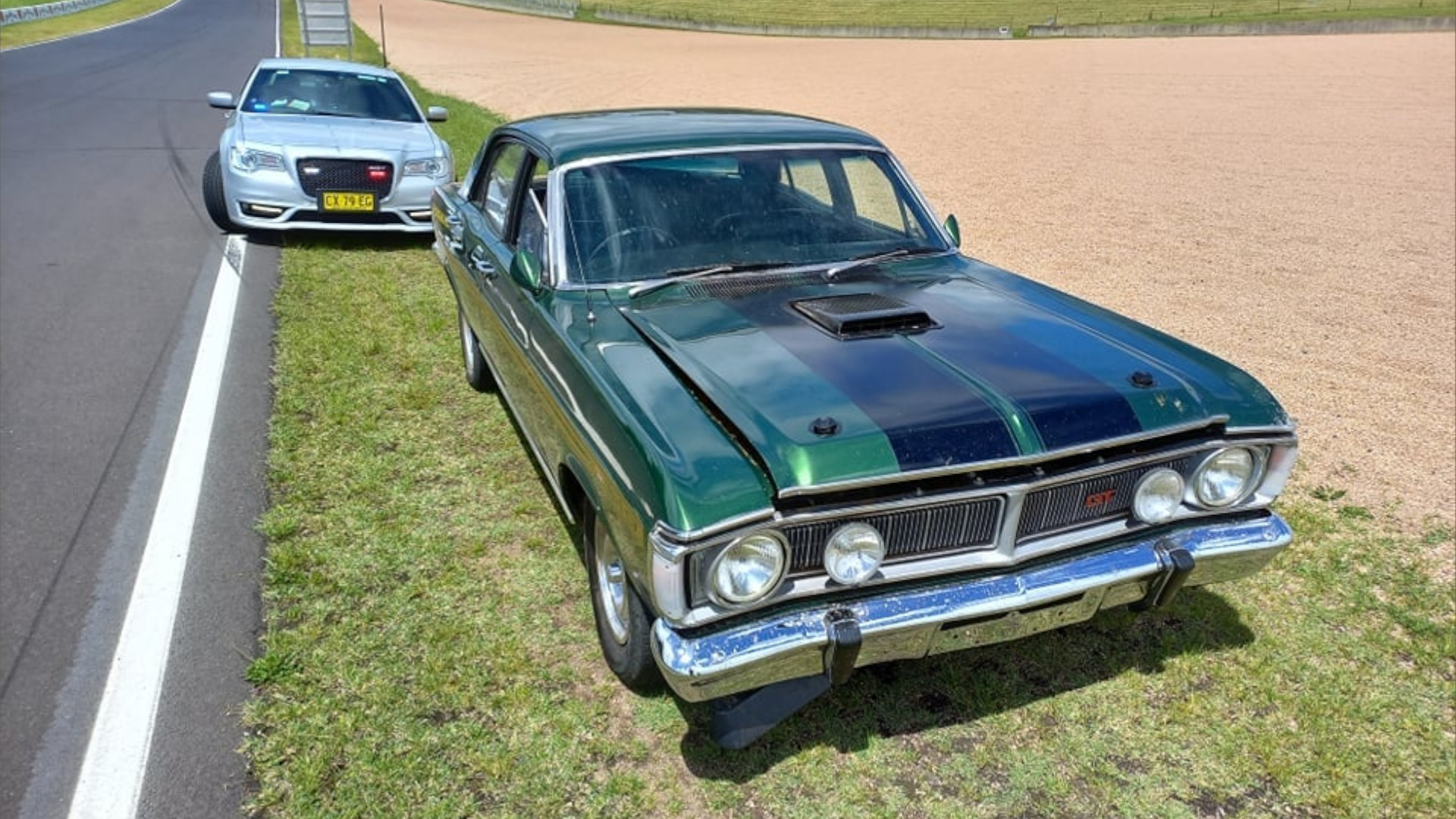 Police claim to have received a call on the 21st of January at around 11:20 AM, concerning a car that was speeding and driving on the wrong side of the road on Mountain Straight at Mount Panorama. Reportedly, a green XY Ford Falcon GT with no number plates was then clocked with a speed camera traveling at a speed of 125 km/h (77 mph), well in excess of the posted speed limit of 60 km/h (37 mph).