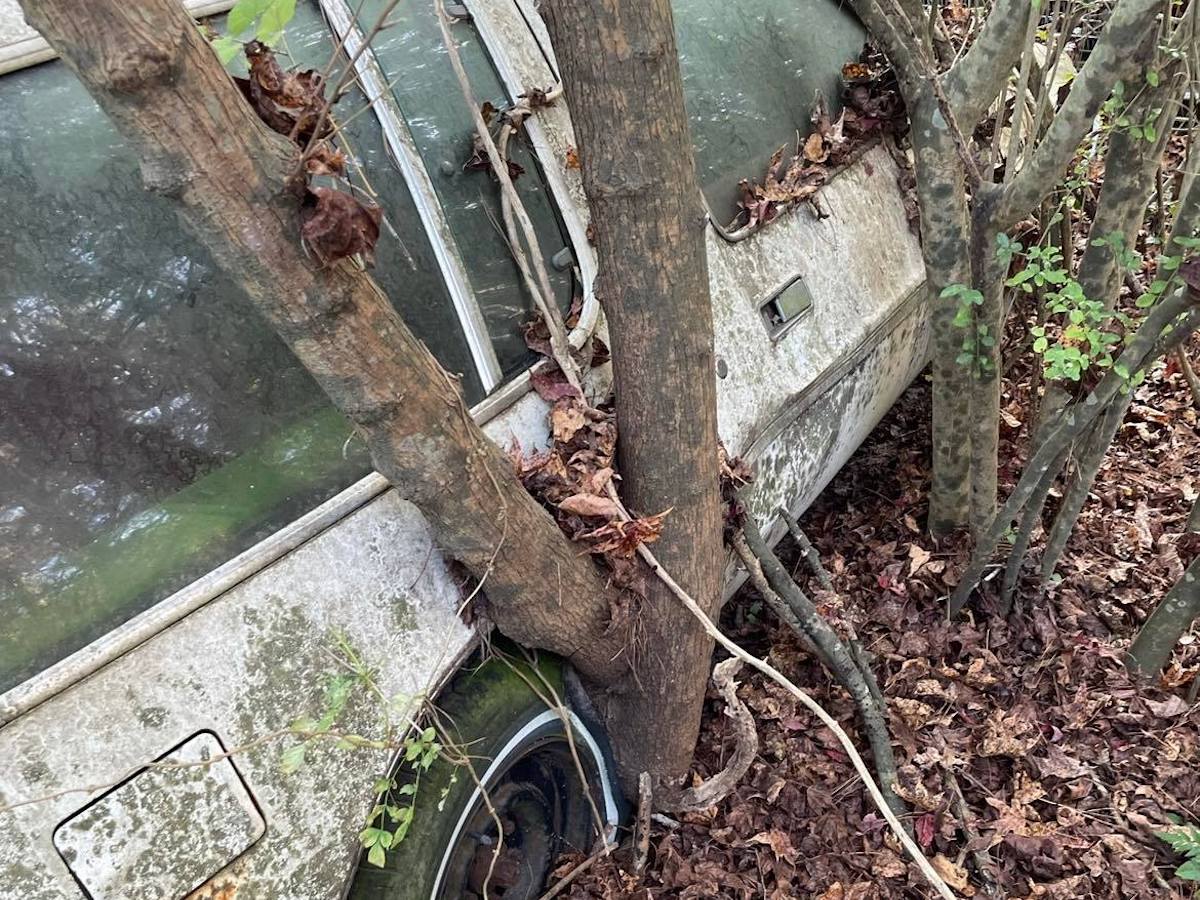 Robbie said similar had happened with a white AMC Pacer a couple months back, and that separating it from the tree ended up requiring uprooting the tree with a wrecker.