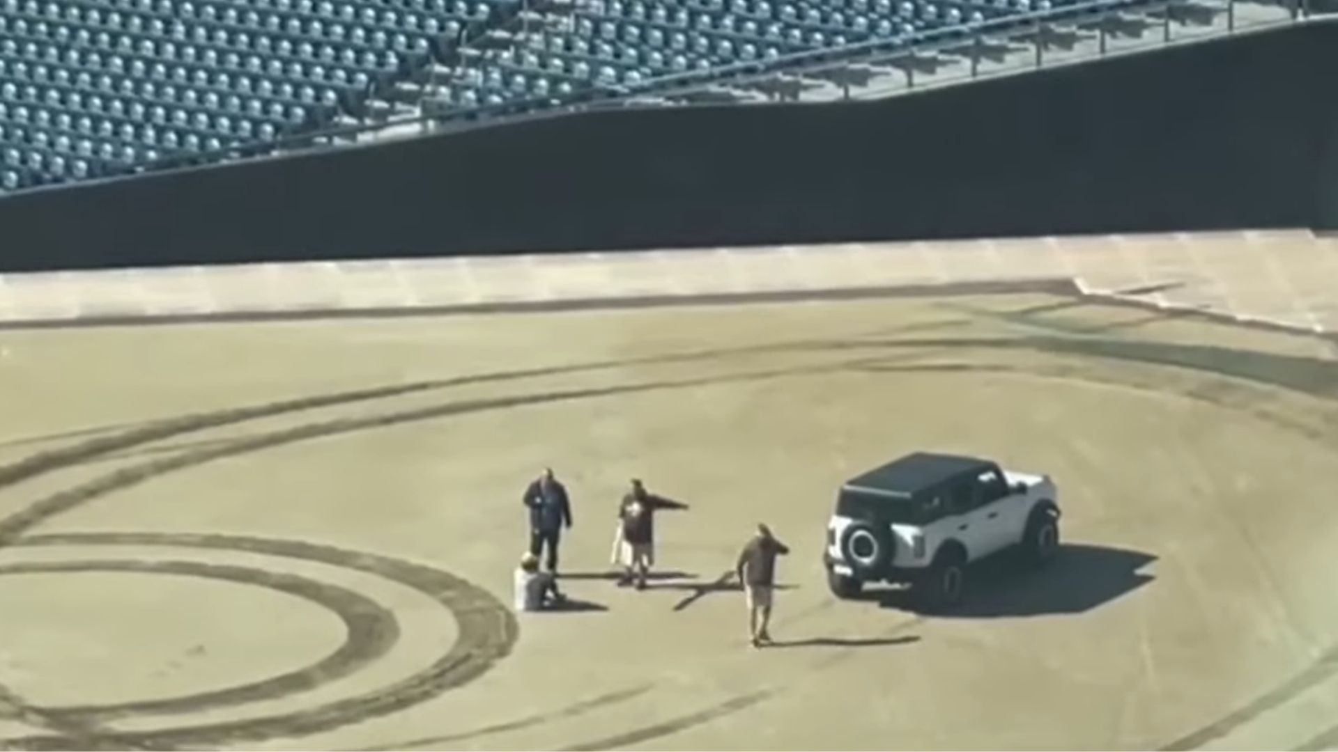It appears that one San Diego resident is taking out his frustrations about the delay (or probably just being a fool) by driving onto the infield at Petco Park and ripping donuts in his Ford Bronco. The as-yet unnamed man didn’t get away with making a mess at the San Diego Padres home field. Staff from the grounds crew drove a forklift to the tunnel entrance where the perpetrator entered, blocking his exit. When the police arrived, the driver was arrested.
