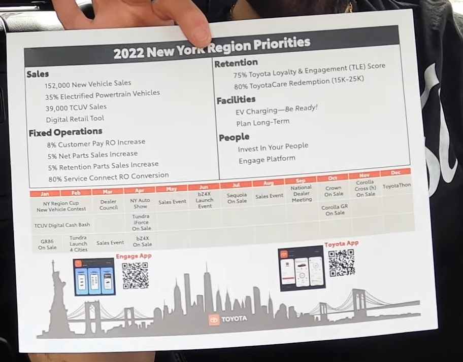 At 1:20 in the video, Driven District shows a document entitled “2022 New York Region Priorities” that features a calendar of upcoming product releases and events for 2022. Amidst other tidbits like a mention of the Toyota Crown being on sale, the calendar has “Corolla GR On Sale” listed for the month of October.