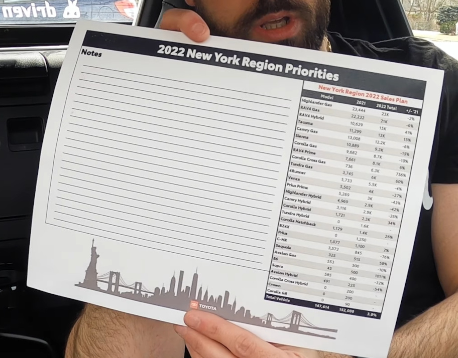 Regardless, our host doesn’t miss the chance to try and drum up some business for his partner. “My girlfriend does work at Toyota,” he states, adding that “if you’re in the tri-state area, you wanna get a Toyota, be sure to reach out to me. She’ll get the best deal she can for you and everything.” In any case, if your partner relies on a paycheck from an automaker, it’s probably not a great move to leak internal company documents, whether you stole them or they provided them directly.