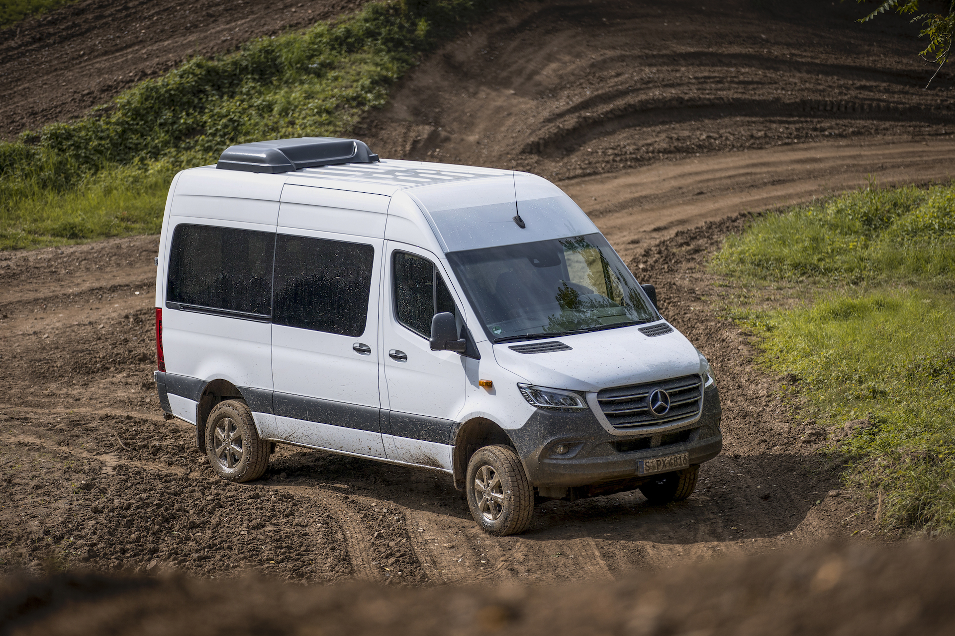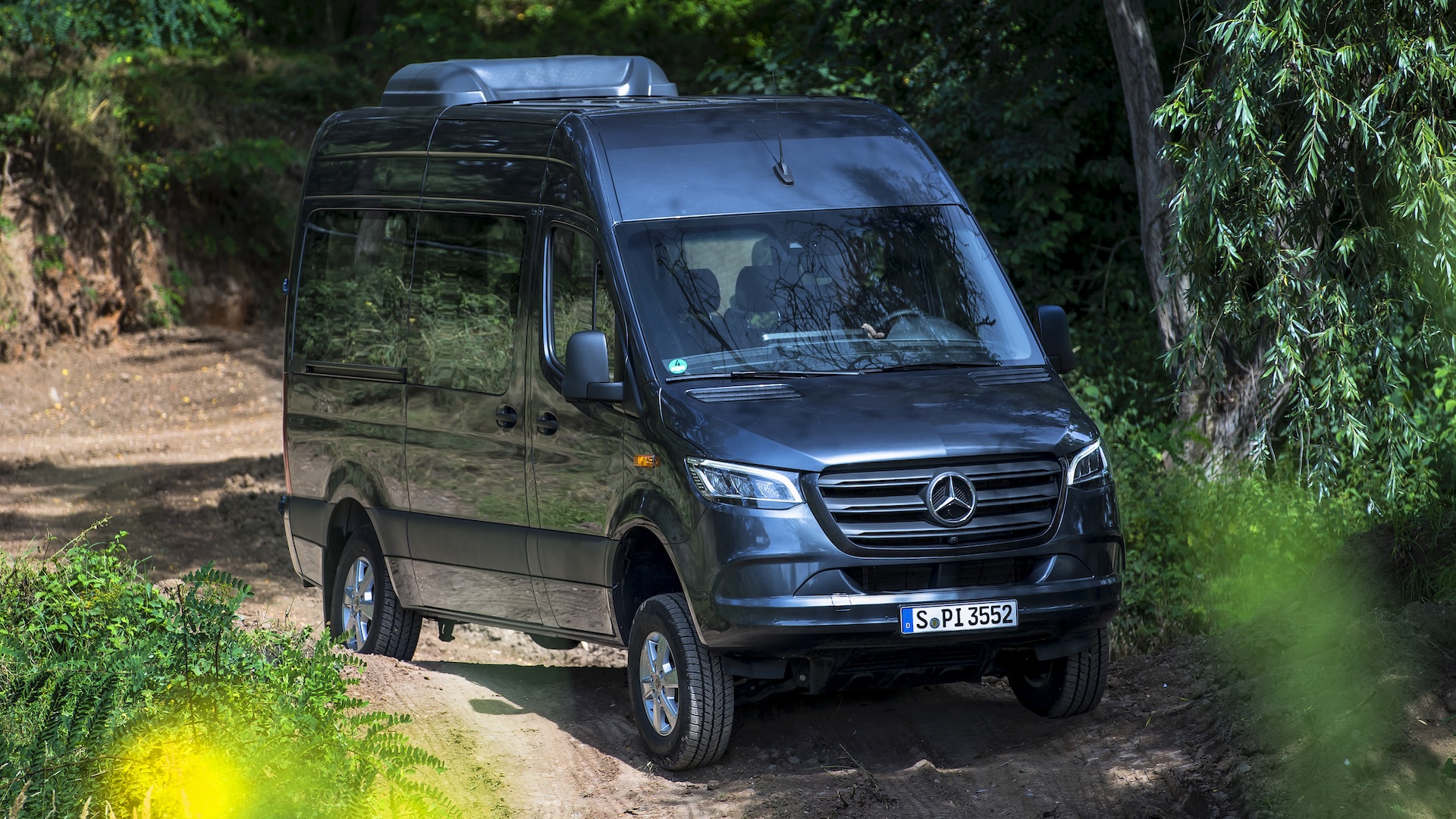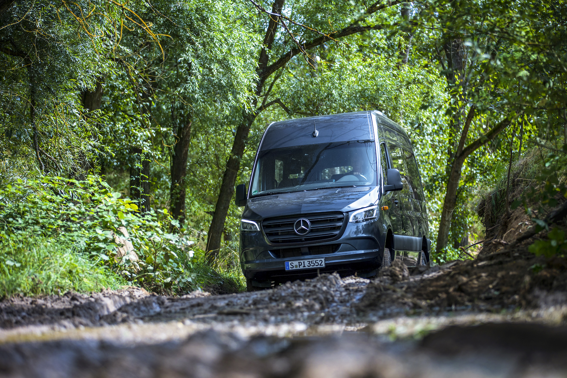 Replacing the Sprinter’s previous 4×4 system is a new all-wheel-drive setup that’s been borrowed from the company’s passenger cars. It can send up to 50 percent of torque to the front axle (versus a max of 35 percent previously). According to a Mercedes spokesperson, the AWD system here does not feature a physical differential lock but instead uses the automaker’s “4-ETS” tech to monitor traction on a per-wheel basis and split torque accordingly between the axles.