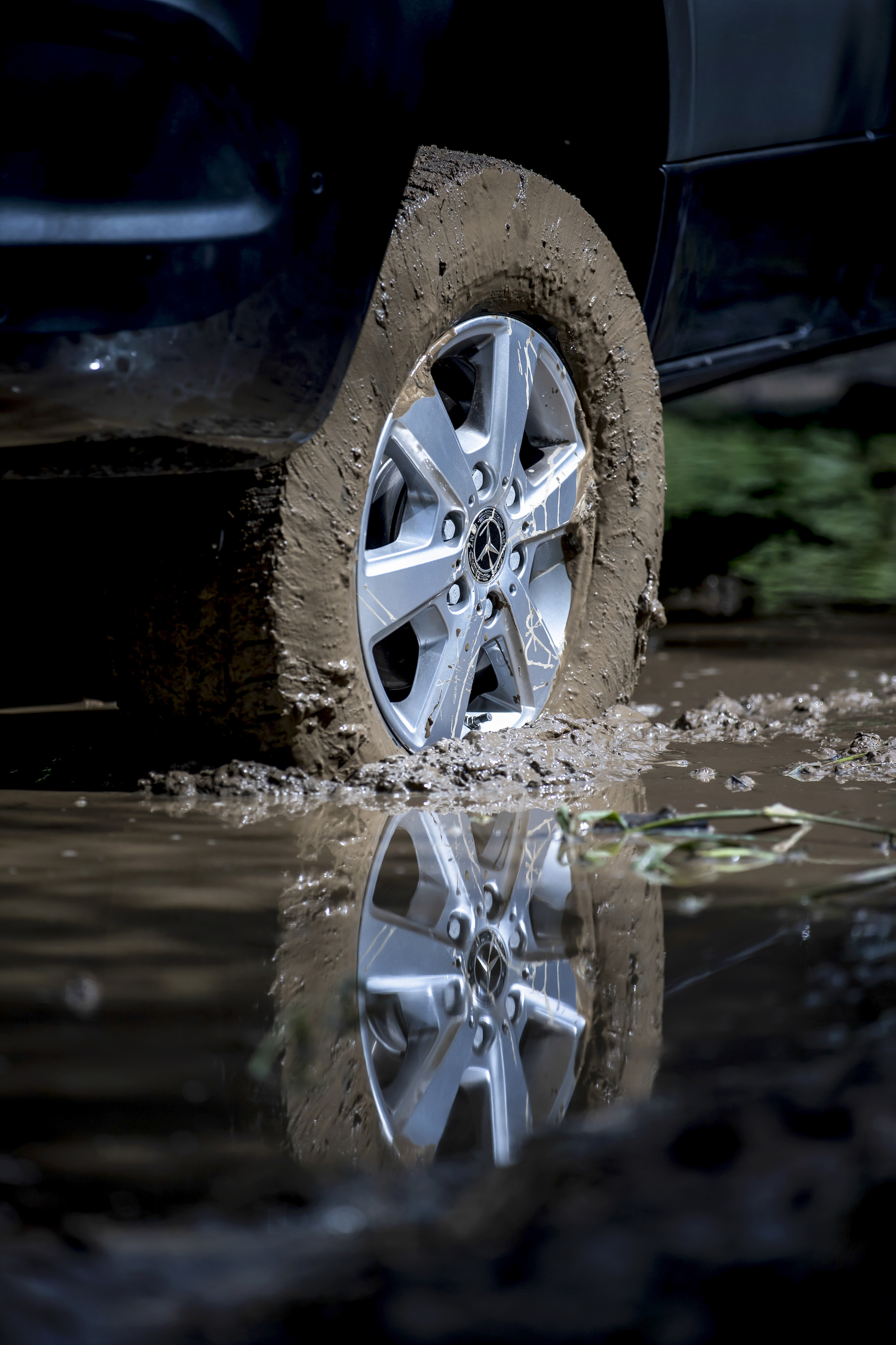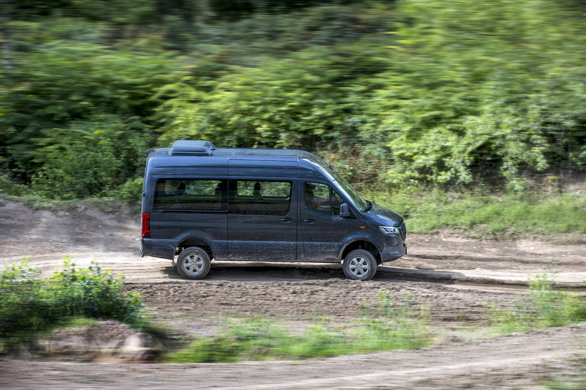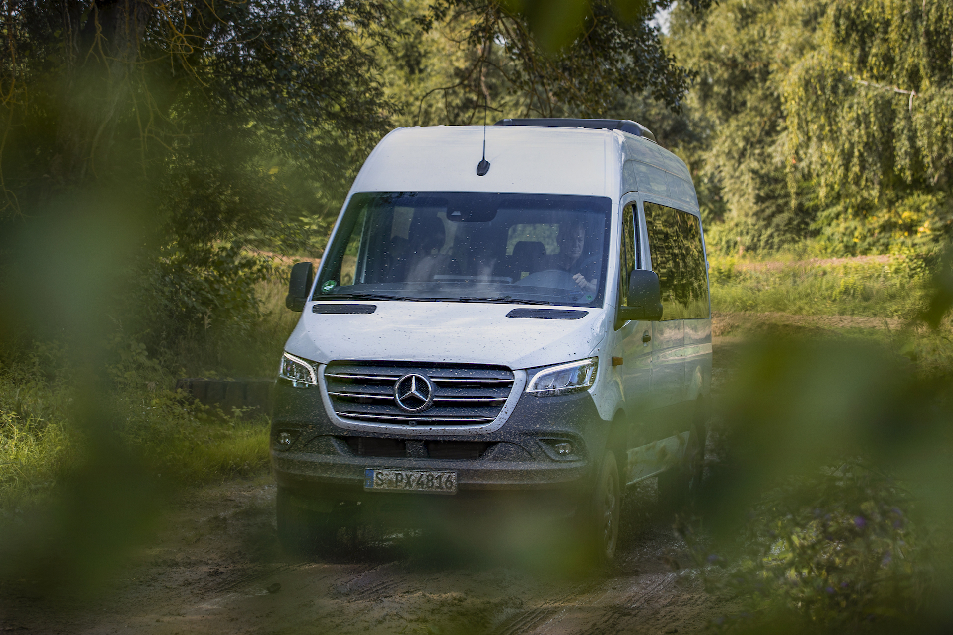Replacing the Sprinter’s previous 4×4 system is a new all-wheel-drive setup that’s been borrowed from the company’s passenger cars. It can send up to 50 percent of torque to the front axle (versus a max of 35 percent previously). According to a Mercedes spokesperson, the AWD system here does not feature a physical differential lock but instead uses the automaker’s “4-ETS” tech to monitor traction on a per-wheel basis and split torque accordingly between the axles.