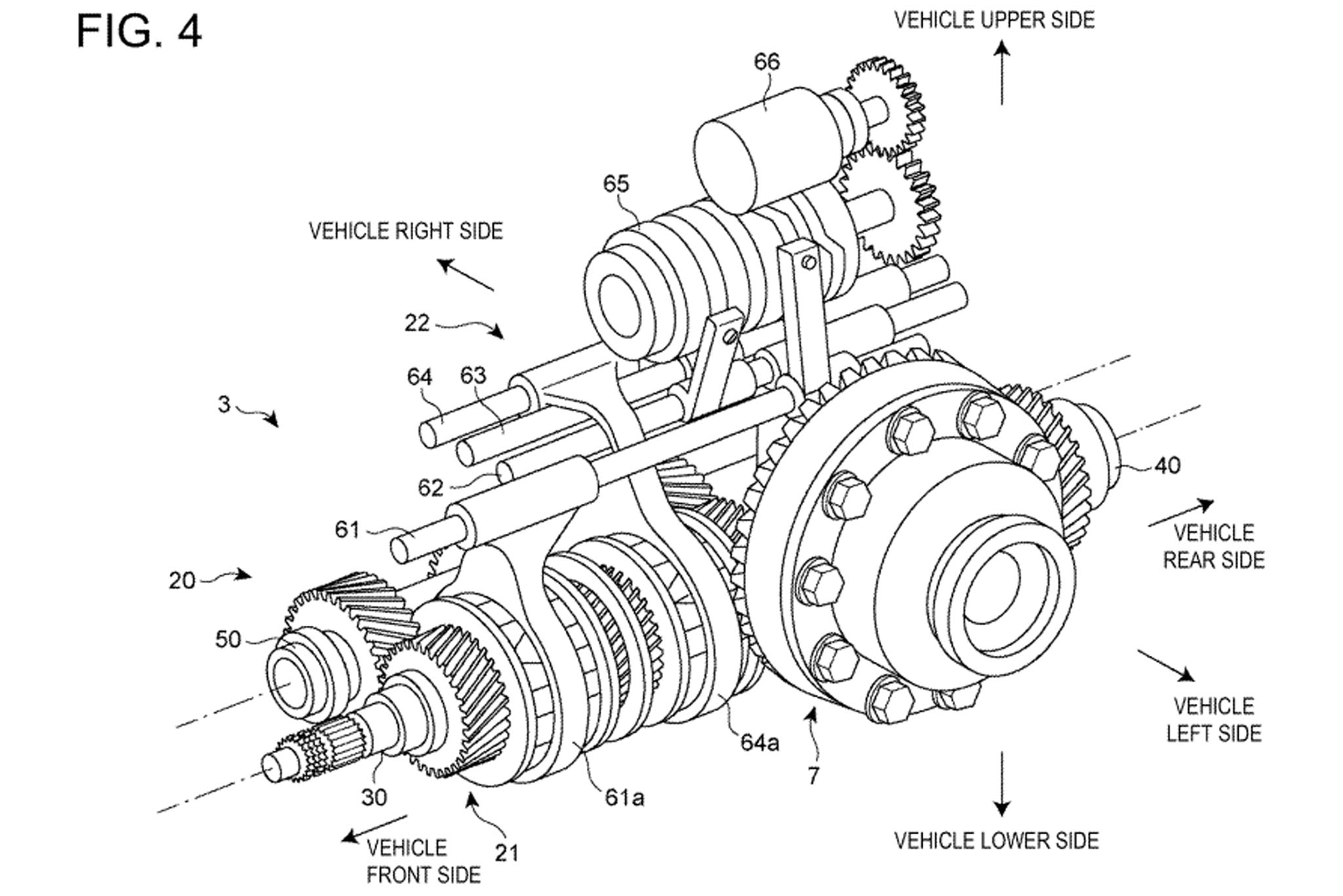 This unconventional design, the patent explains, is primarily to save space. For some context, the original Mazda patent we covered last week said using a transaxle in the first place was to make more room for the occupants, so in addition to going with an overall layout to add to the cabin volume, they’re also utilizing a compact design for the transaxle itself to further boost the savings. Just the same, the document says this layout is better for “operational stability,” aka handling. It’s all very Mazda.