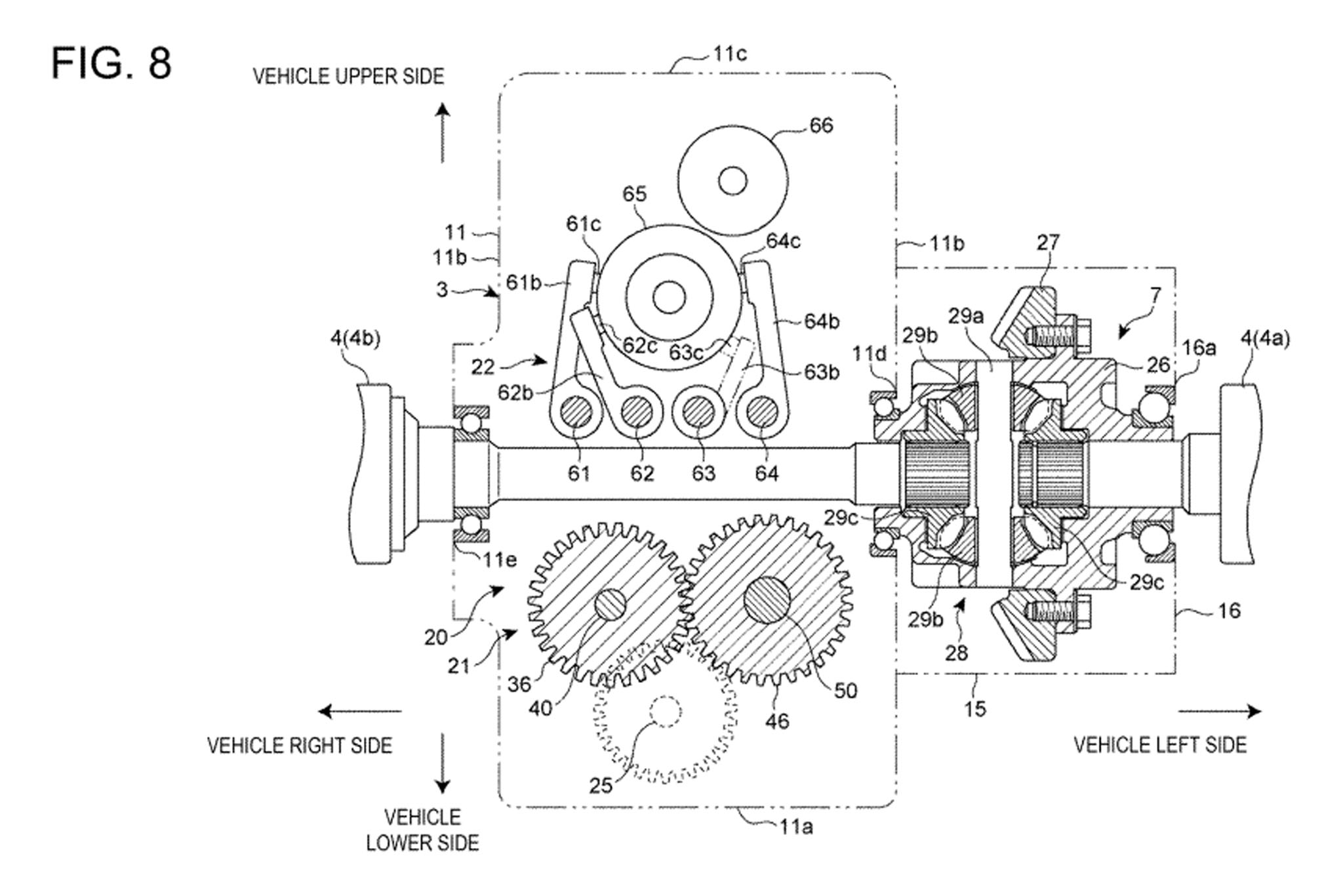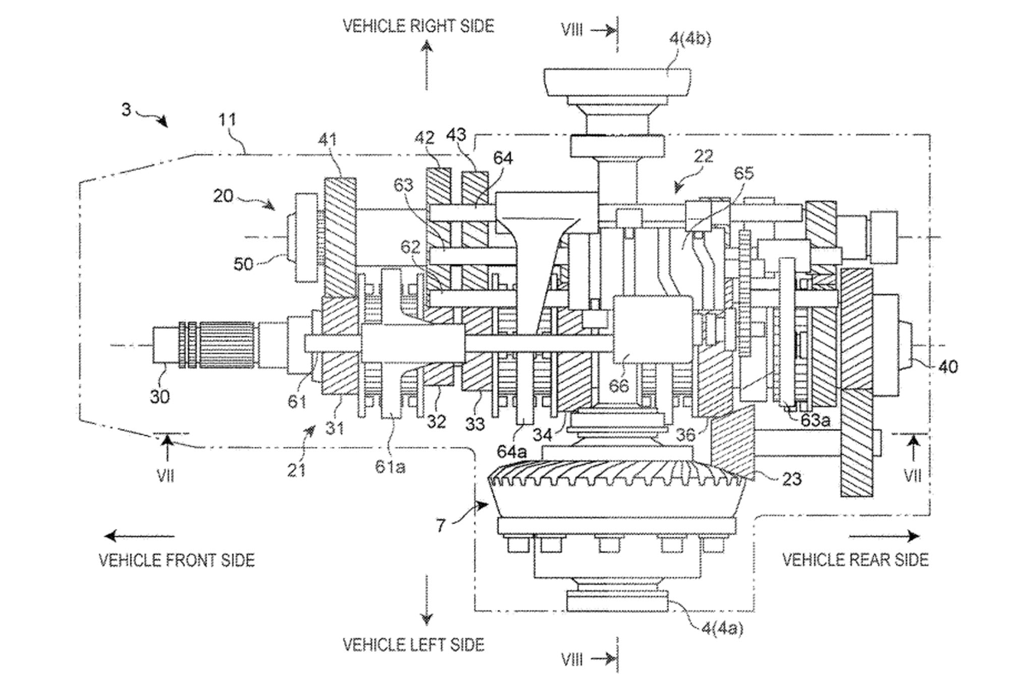 For those still uncertain about the exact connection between this and the former patent, it’s to be noted that this document references the fact that this transaxle could be used in a “four-wheel-drive” context. It mentions this as background in a very roundabout sort of way, and indeed the connection I’m drawing could be considered speculative, but it’s still there in my opinion. The text states that in a layout like this you can achieve four-wheel drive. However, assumedly since this transaxle is not something that can be modified to easily accommodate a forward-facing output shaft (in order to use a conventional transfer case,) you would need a whole other transmission mounted ahead of the transaxle to achieve this. Specifically, it references a Japanese patent where a “continuously variable transmission arranged in a vehicle-body front portion and on a vehicle rear side of a starting clutch,” is used to achieve this.