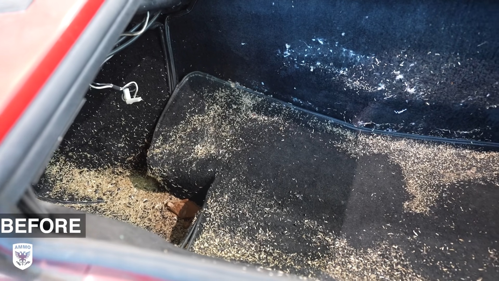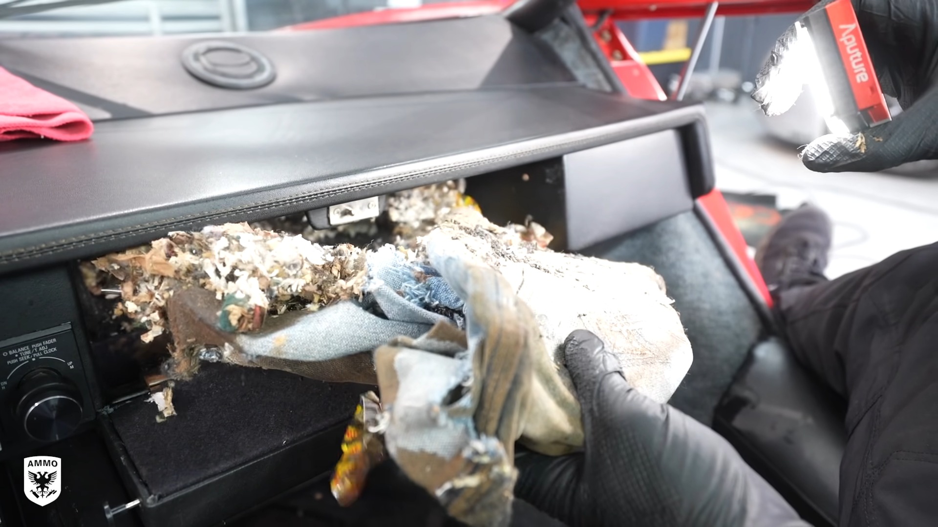 Using a tiny inspection camera, Kosilla found plenty of acorns and mouse droppings in the car’s frame and engine bay, along with a whole lotta animal urine, too. He makes special notes of the “highways” throughout the car where rodents could be seen to have regularly paced back and forth, tracking dirt and their own waste all over the vehicle. All of this had to be scrubbed, steam cleaned and disinfected before the car could be handed off to mechanics for restoration.