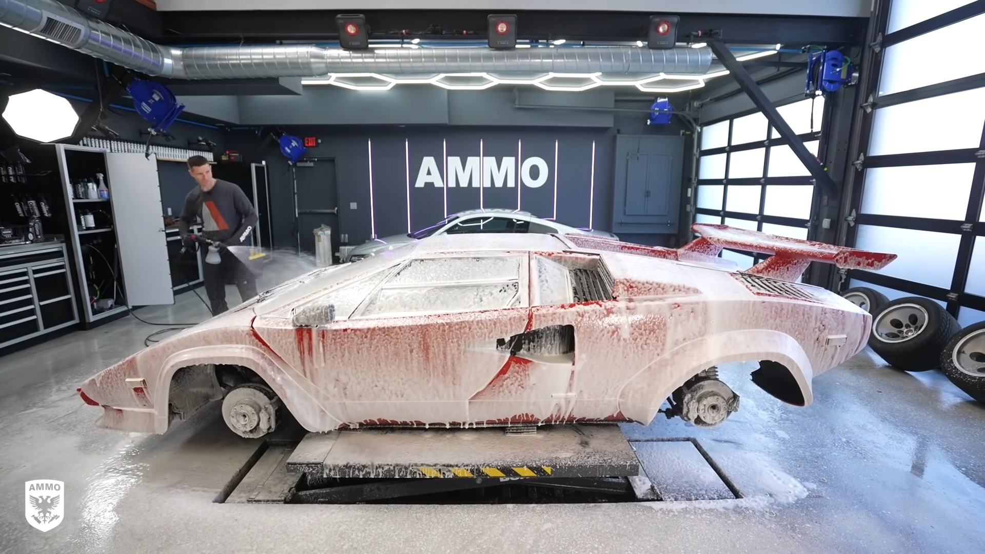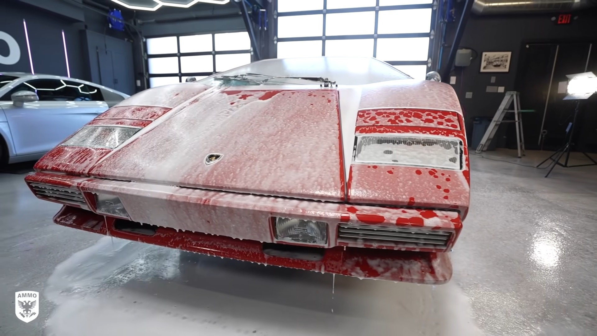 The car was first given a serious powerwash and foam treatment to remove the bulk of the dust and grime and let the chemicals start eating away at the worst of the detritus. Amazingly, only one small leak was found in all the Lamborghini’s body seals, likely as the car lived inside over the last two decades.