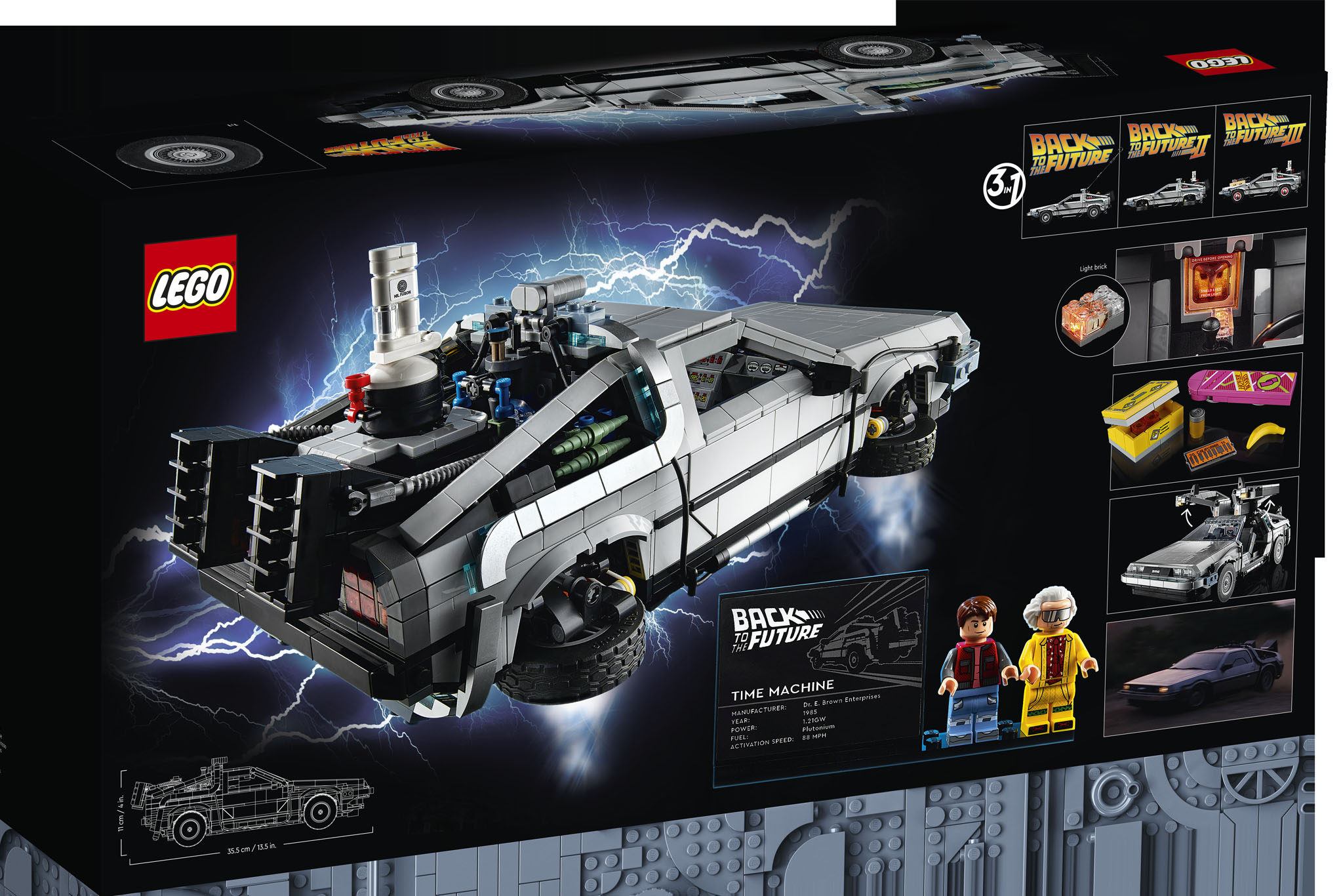 In total, the kit consists of 1,872 pieces, and every configuration is able to fold its wheels up, just like in the film. To further complete the picture, the set also comes with two mini-figures, the identity of whom need not be stated. This level of immersive detail continues on the inside, where the all-important flux capacitor is located along with printed blocks to lay out the DeLorean’s instruments.