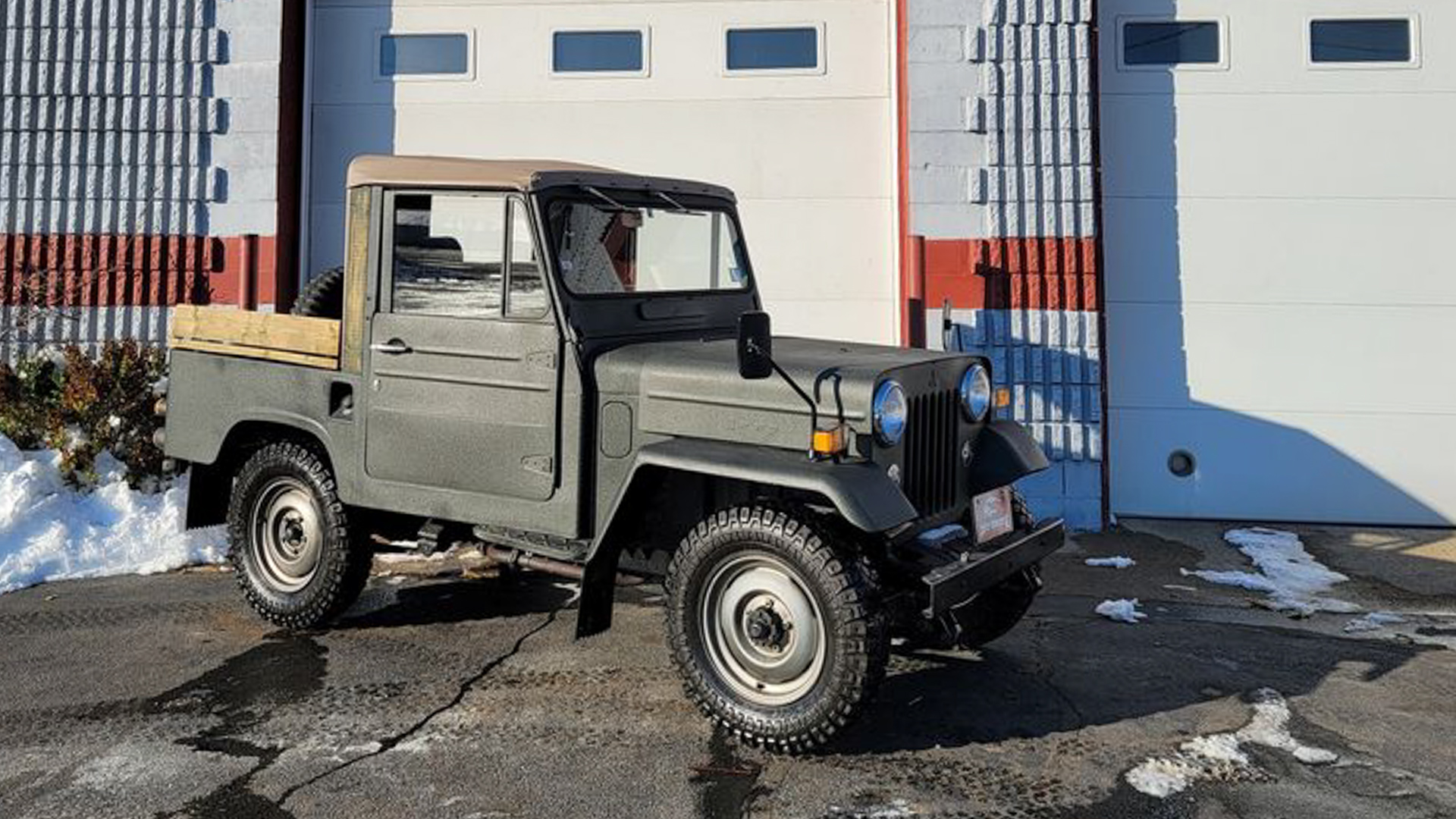 From a glance at the Northeast Auto Imports listing, it appears to be a normal CJ-3 Jeep—after all, it has “Jeep” stamped right into the sheet metal on the front quarter panel. But look closely and you’ll spot a few clues about its true identity. For one, it’s right-hand drive and bears a faintly visible Mitsubishi badge stamped over the iconic bar grille; for another, more obvious hint, instead of a Willys Hurricane inline-four, under the hood is a 78-horsepower Mitsubishi 4DR5 diesel engine. That 2.6-liter inline-four is mated to a four-on-the-tree manual that drives all four wheels, in true Jeep fashion. This specific example was built in 1977 as the Jeep J3, nearly a full decade after the stateside CJ-3 was discontinued.