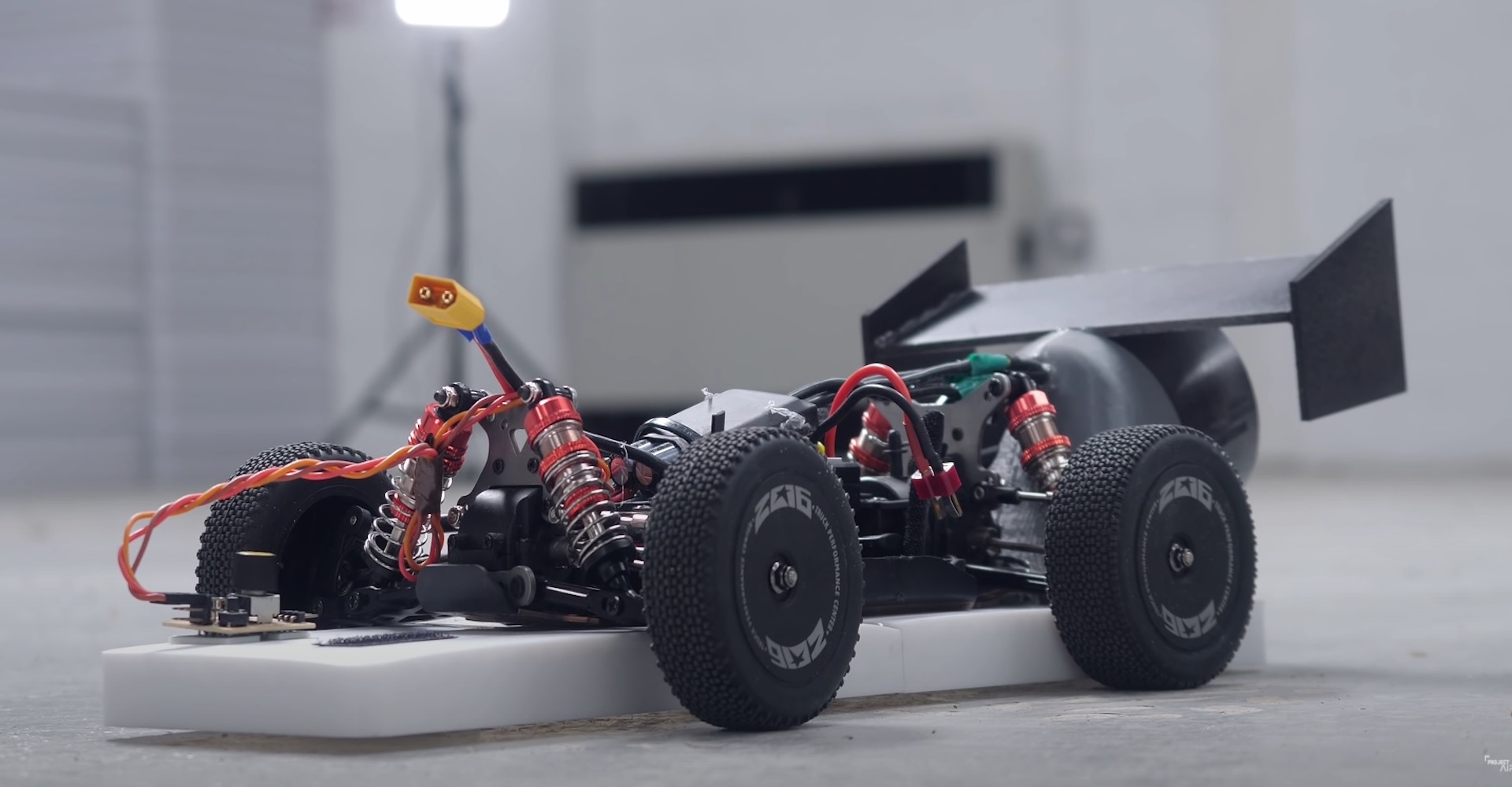That’s when Whomsley redesigned the floor to fit longitudinally underneath the car, providing the largest ground effect area possible. Additionally, rather than two small fans, he fit one much larger fan to the back, truly channeling Murray’s BT46B fan car. This single-fan setup was so much more effective, that the RC car could actually stick itself to a surface upside down and hold its own weight. With the new floor and a functioning skirt in place, he brought both the modded car and the stock car to a warehouse to test them both out.