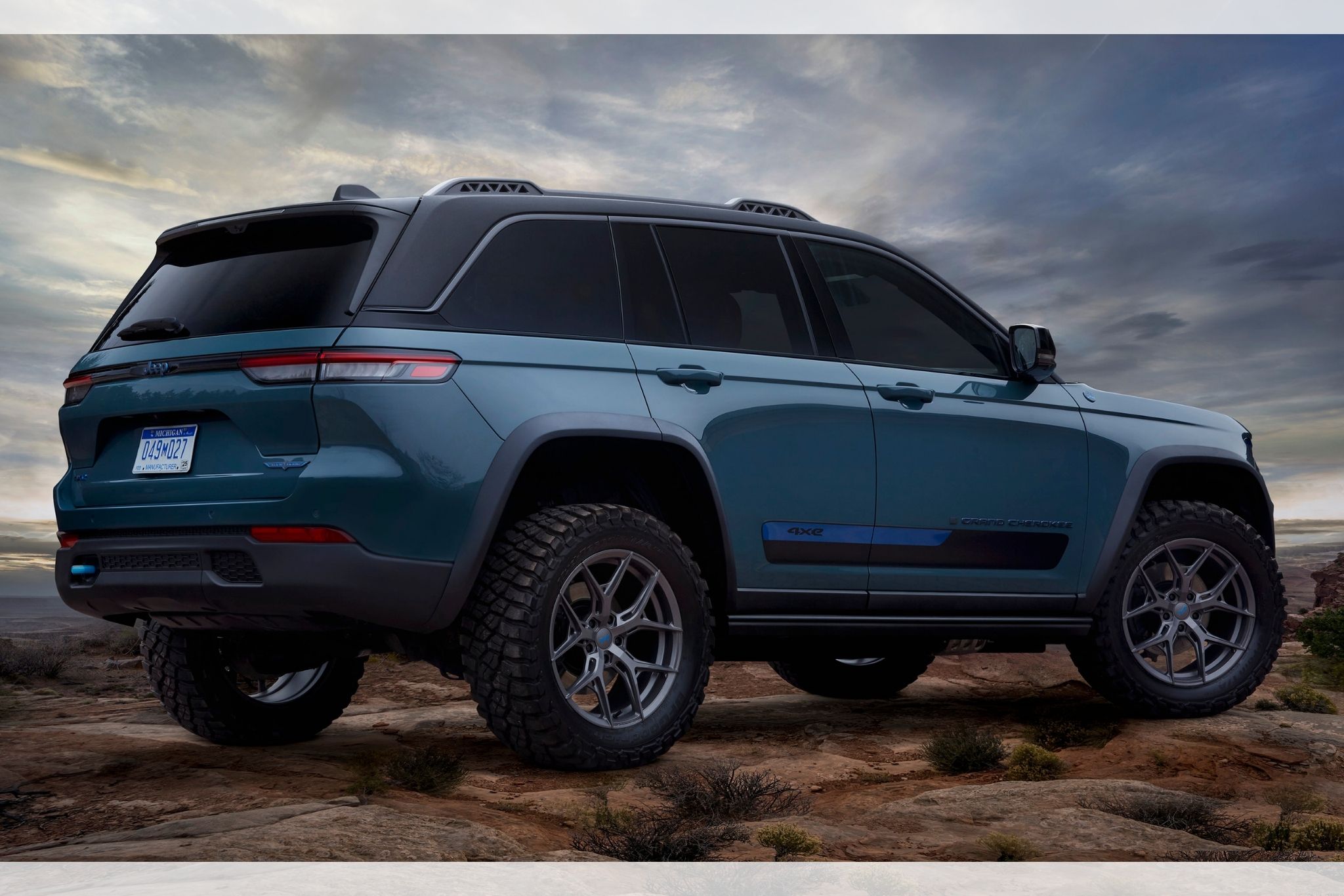 The newest member of the Grand Cherokee family, the hybrid 4xe, is debuting at the Easter Jeep Safari resplendent in a coat of Industrial Blue, accented by 4xe Lagoon Blue tow hooks. Jeep says the 4xe’s two electric motors, a 400-volt battery pack, 2.0-liter turbocharged, four-cylinder engine will return 56 MPGe and 25 miles of all-electric range.