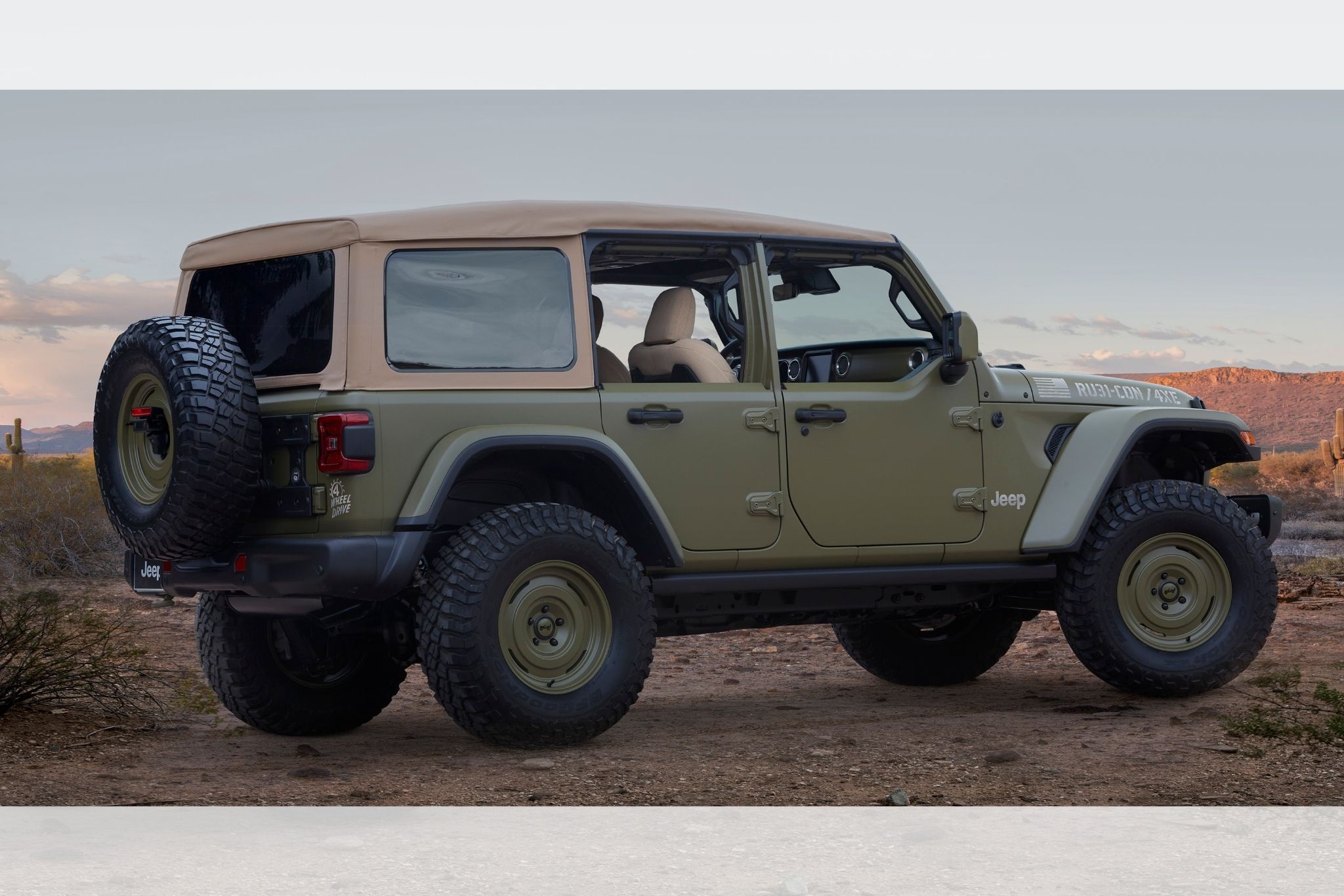 From the outside, you’ll see this concept as a tribute to the Wrangler Willys of yesteryear, but the ’41 Concept is a modern Wrangler 4xe underneath. It’s fitted with two electric motors, a battery pack, a 2.0-liter turbocharged inline-four engine and an eight-speed automatic transmission. With an estimated 49 MPGe and up to 21 miles of electric range, this Jeep might sneak up on you on the trail in EV mode.