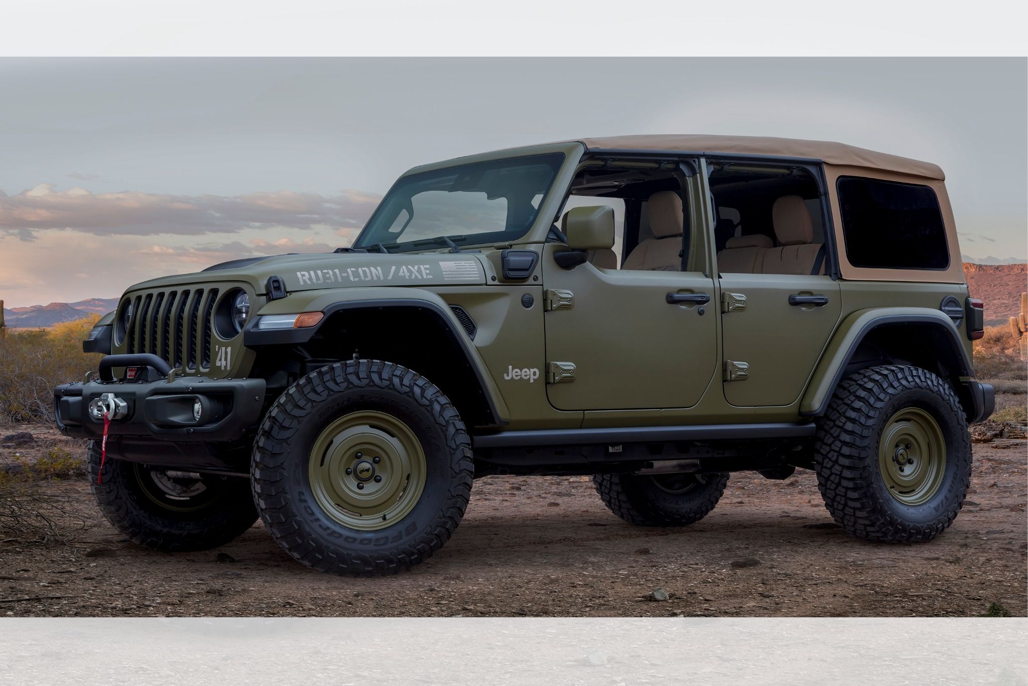 Jeep’s D.R.A.B. ‘41 matte green takes center stage here from the exterior paint to the instrument panel inserts to the Rhino-lined heavy texture floor. It sits on seventeen-inch Fifteen52 wheels, 35-inch tires, and a JPP two-inch lift kit. Retro design touches include a tan soft top, JPP half doors, and a throwback shifter with custom Army-style graphics. Fans of M.A.S.H., Saving Private Ryan, and Hogan’s Heroes are going to dig this one.