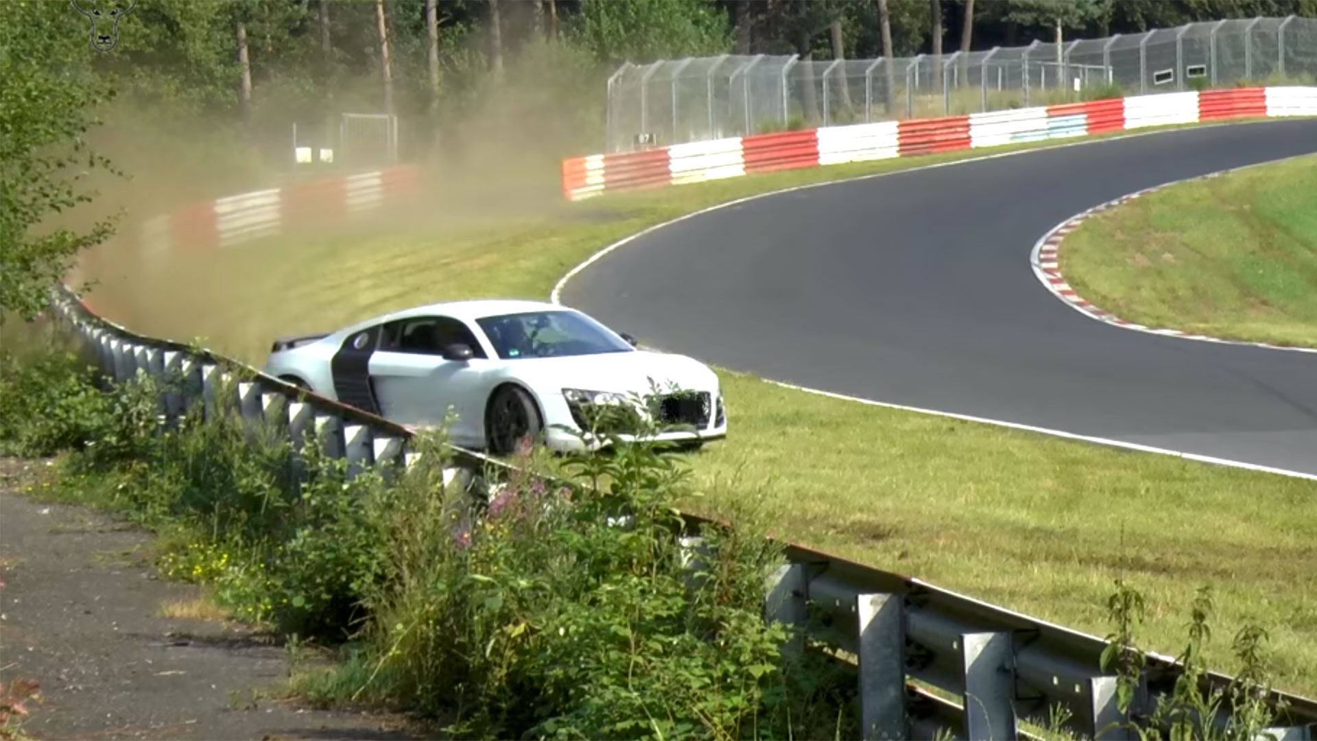 The clip, which brings to mind the recent Koenigsegg One:1 crash at the ‘Ring, starts out looking bad for the Audi. The R8 comes screaming over a rise far too fast, almost immediately understeering off the pavement. But the driver of this mid-engined Audi clearly had a quality driver’s ed teacher; he cranks the nose towards the tarmac and lays on the throttle, and the all-wheel-drive claws the R8 back to the track. (Once the car is off-camera, things may have taken a bad turn—there’s an unpleasant metallic sound at the very end of the video—but since we don’t know for sure, we’ll hope for the best.)