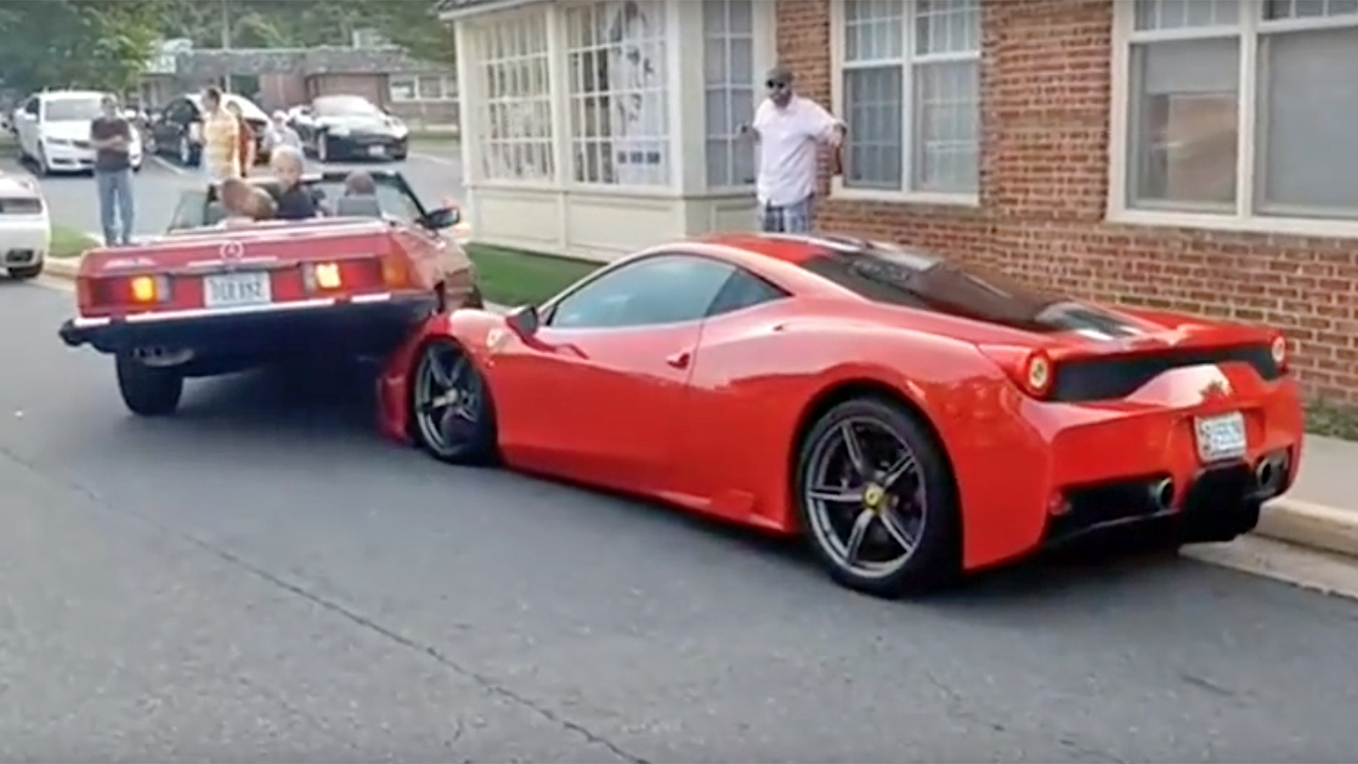 Whether on the streets of Manhattan or in the middle of a car show, street parking is never completely safe. Just last weekend, a Mercedes-Benz 380SL rearranged a Ferrari 458 Speciale’s face in the midst of a Cars and Coffee event in Great Falls, Virginia.