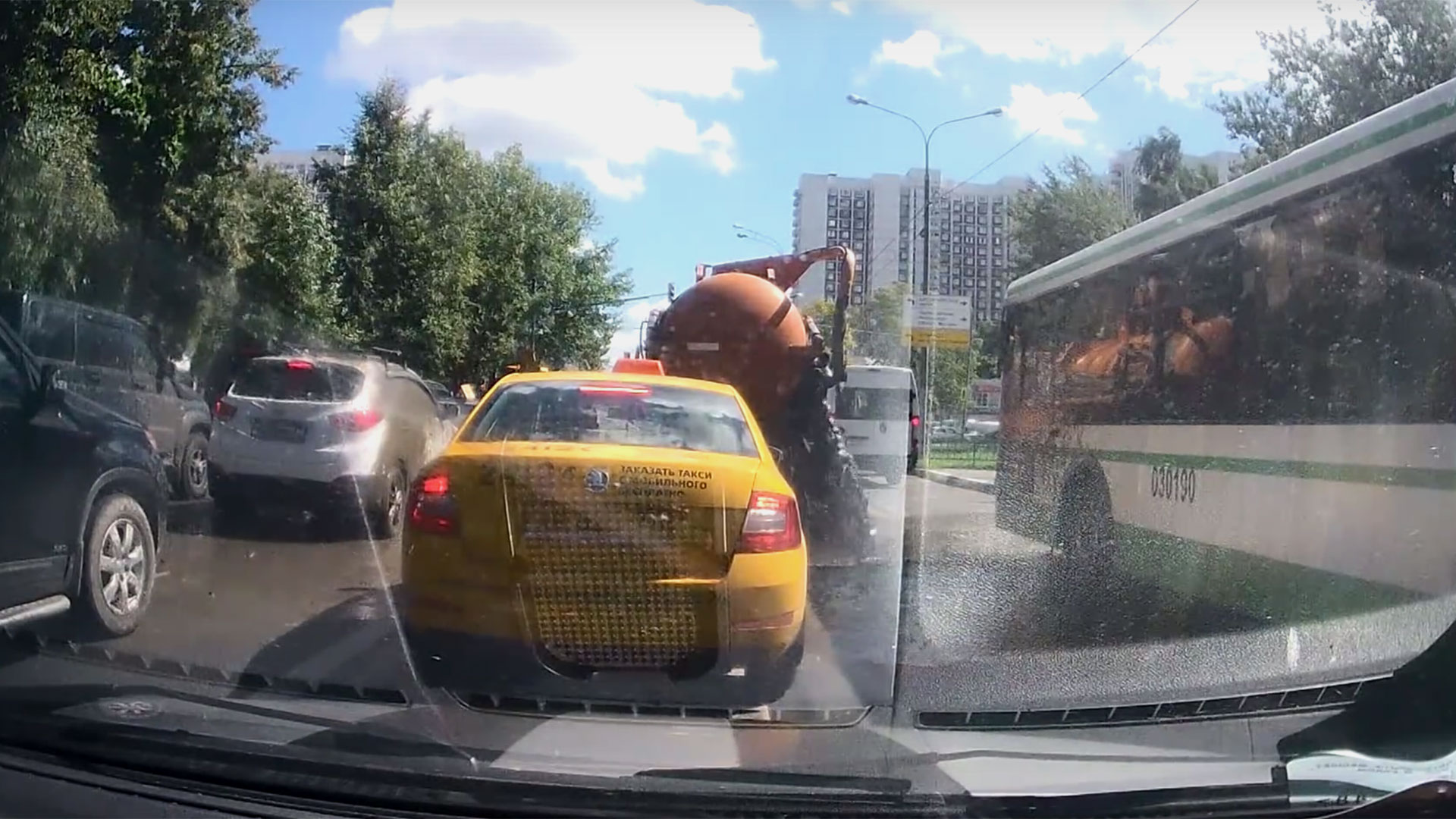 A dash cam video uploaded to YouTube on Monday shows several vehicles sitting at a traffic light in Moscow. Nothing seems out of the ordinary…until the orange tanker truck parked ahead of the camera car explodes, spewing brown sewage all over the side of a Hyundai Tucson and and painting the side of an unfortunate public bus that was sitting next to the truck when the tank, shall we say, relieved itself.