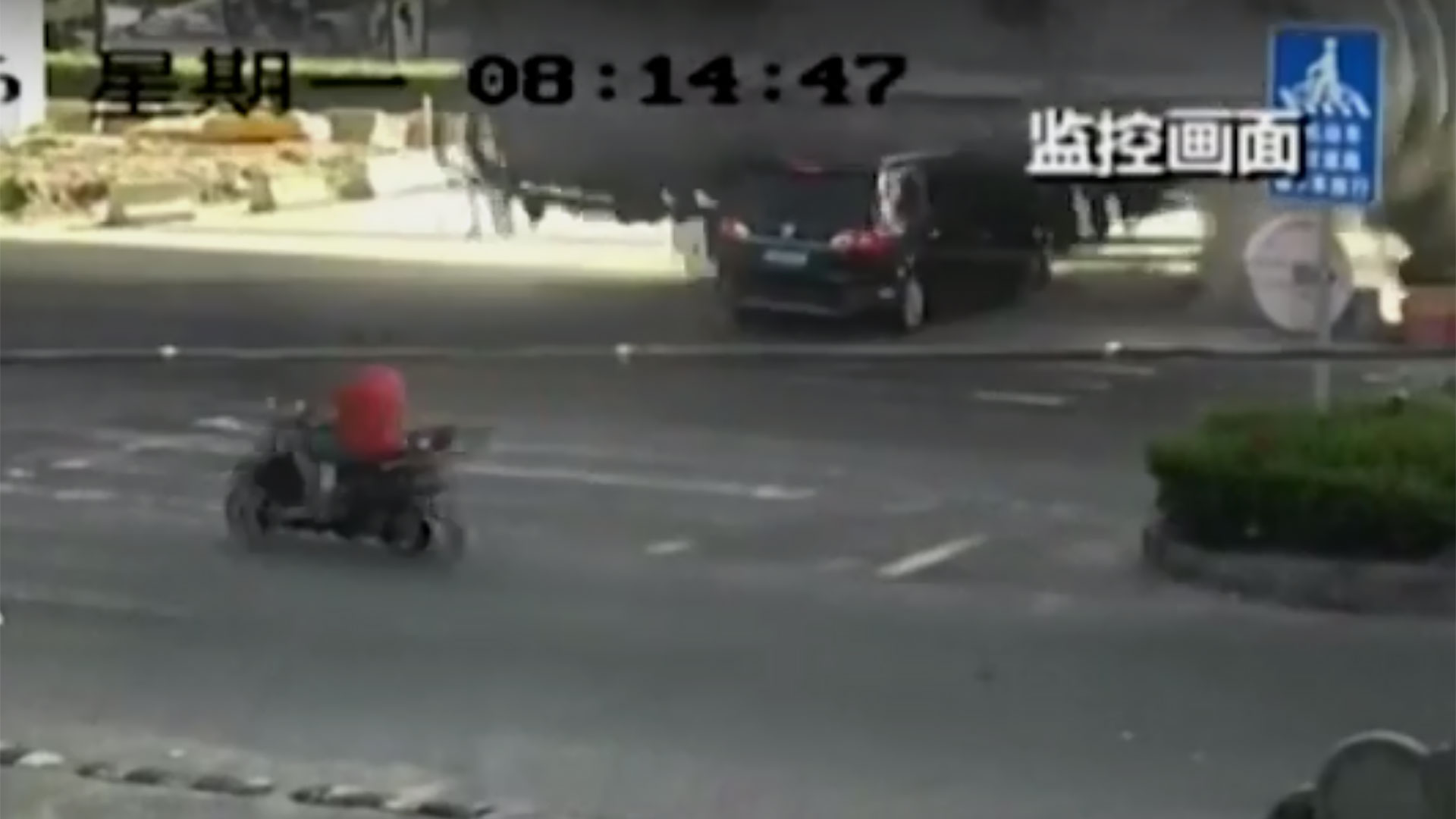 The accident, which occurred on August 15th in Ningbo, China, was recorded on a nearby security camera; the footage has since been uploaded to YouTube by the Associated Press, among other outlets. In the video, you can see the black minivan cautiously pulling through what appears to be a rather confusing intersection; suddenly, a tanker truck comes hurtling into the frame from the left, tilting uncontrollably to starboard. It almost clears the minivan…only to fall sideways onto the passenger cabin, crumpling the sheetmetal like a heavy boot on a beer can.