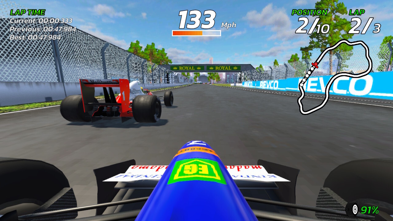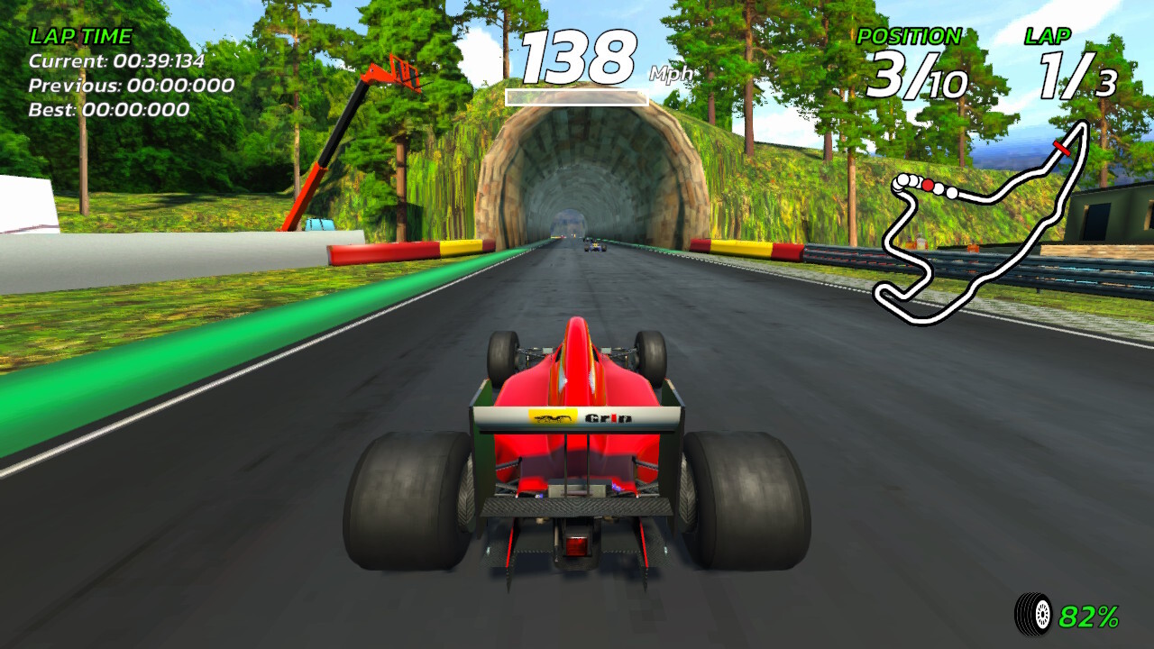 Short for Four Player Grand Prix, this is a new indie racer developed by Vision Reelle and 3goo, very clearly inspired by Sega’s revolutionary Virtua Racing from 1992. The cars are all send-ups of famous Formula 1 machinery from the ’90s, and the tracks are essentially downscaled versions of real-life F1 circuits, the main difference being that you can complete a lap of one of them in 40 seconds rather than a minute and a half. They generally have fewer corners, too, and larger scenery with arcade-like hallmarks. 4PGP’s spin on Spa-Francorchamps has a suspension bridge and a giant tunnel, for example. I know we all love Spa, but I think it could use a tunnel, don’t you?