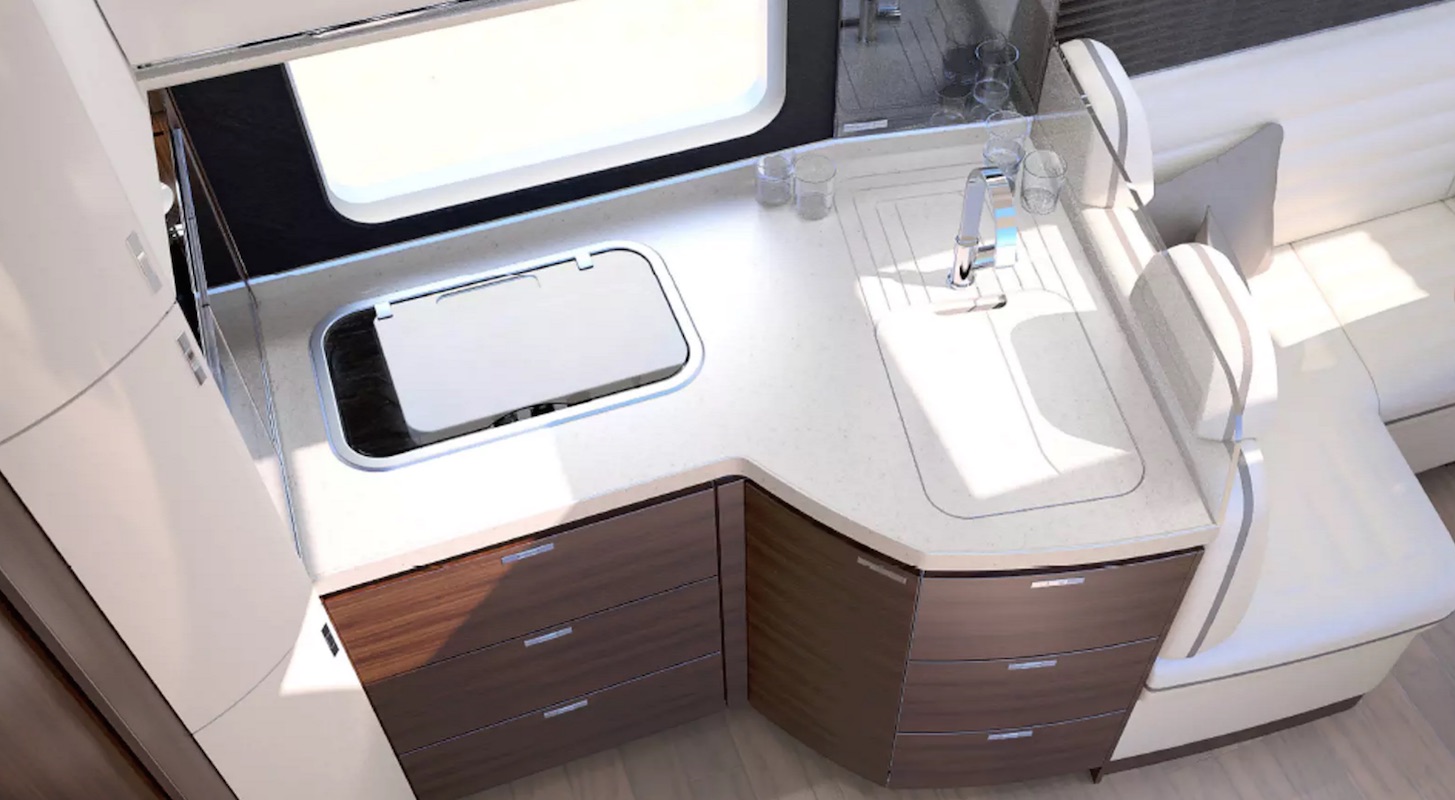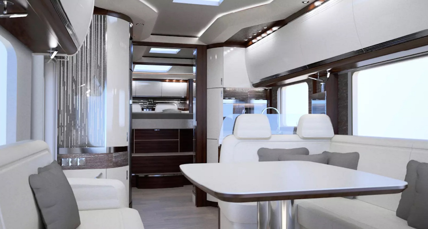 Morelo is currently taking the state-of-the-art Empire Liner, their “super-liner,” around to European recreational vehicle shows, where it’s turning heads. The builders have likened their sleek 37-foot home to a Lamborghini, though the Empire Liner’s chassis is either a Mercedes Atego or a IVECO Eurocargo, depending on the buyer’s preference. The powertrain is a 6-cylinder, 7.7-liter diesel engine with 300 horsepower and 885 lb-ft of torque. On smaller units, the garage, situated underneath the bedroom in the rear, will store a few scooters. On the larger specs, the garage is suitable for SmartFortwos, Fiat 500s or Mini Coopers.