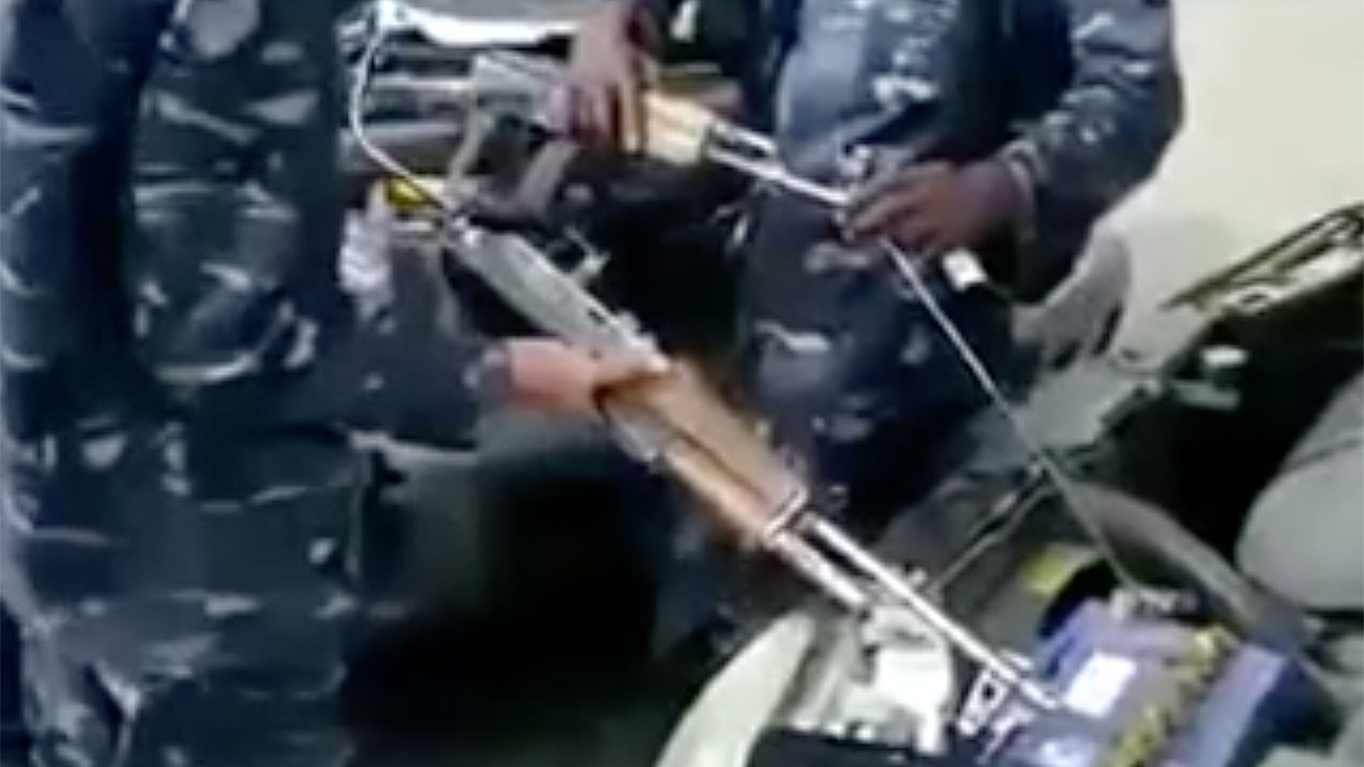 Still, the resolution is high enough to figure out what’s happening. In the clip, a pair of men wearing fatigues stand between two cars with their hoods up, in the traditional fashion of people jump-starting a vehicle. But instead of holding a pair of jumper cables, each man is clutching one of Mikhail Kalashnikov’s iconic assault rifles, connected to some sort of wire or pole long enough to bridge the gap. There’s a brief moment of dialogue; the car donating its electrons through the AK-74s revs its engine, and a few seconds later, the dead car seemingly comes to life in a whining crecendo of rpm, suggesting the MacGyver-esque jump-start worked like a charm.