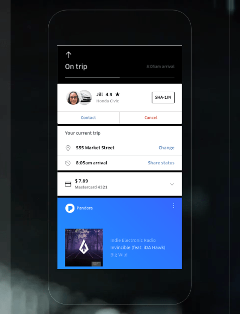 Each draws info from the ride in progress for functionality. (Example: UberEats, also integrated, orders food to sync with arrival time; if the destination is a public transportation hub, a new Transit app links to train or bus schedules.) Idea being to keep you inside the Uber app during the ride; no popping out to change Pandora or check the destination restaurant’s menu on Yelp. Other smaller revisions, like displaying the car’s actual color on the roaming map view, seem more helpful.