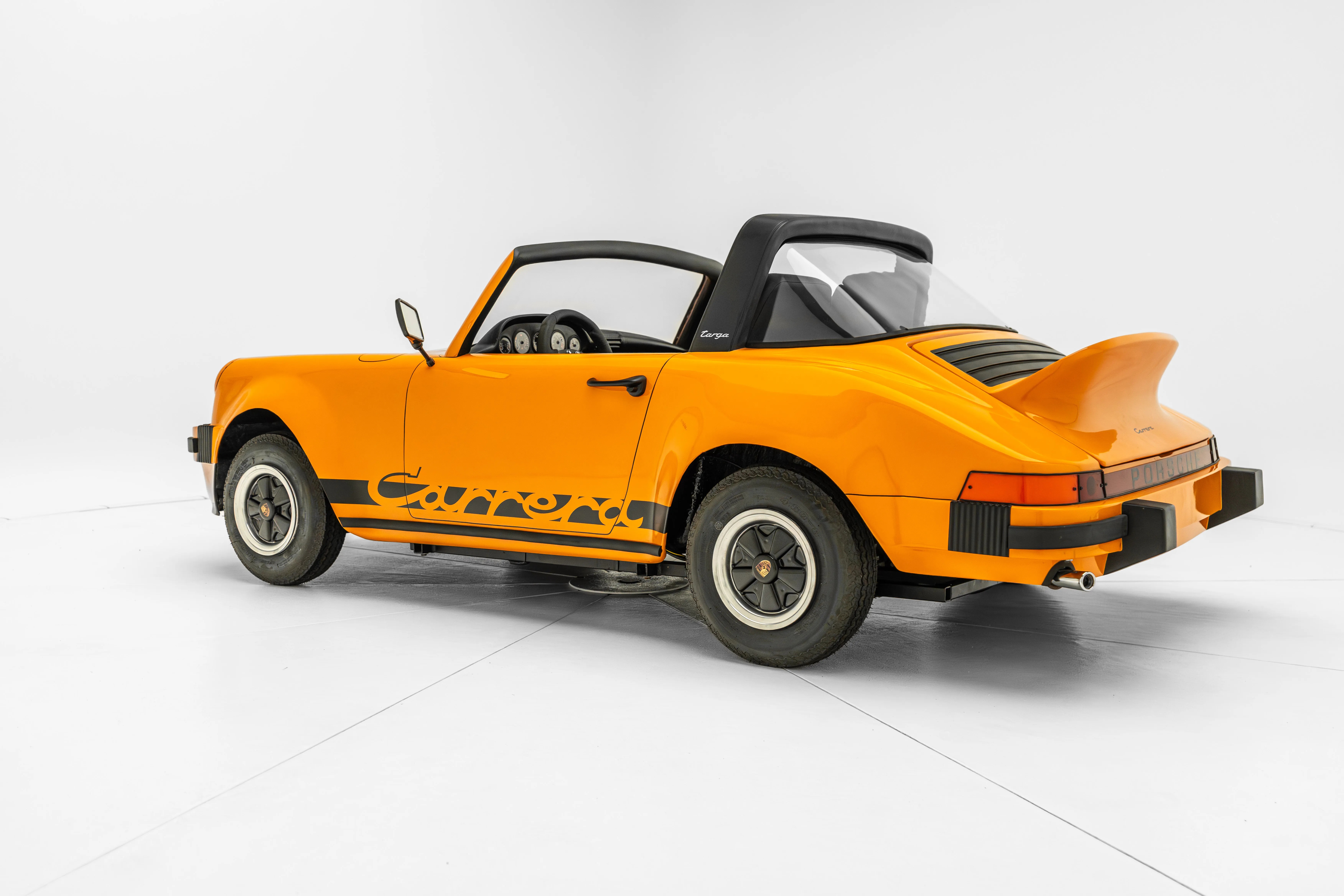 Featuring fiberglass bodywork over a tubular steel frame, the petite Porsche is also equipped with a plastic windscreen and rear window, a ducktail spoiler, a black Targa-badged roll bar, “Carrera” graphics, and a Porsche hood emblem to complete the mini replica look.
