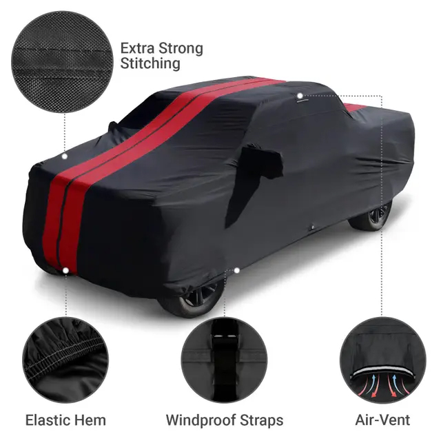 These covers can be ordered in plain and simple grey or black, or you can get them with different color racing stripes, which is kind of fun. That’d be especially helpful if you have multiple vehicles you like to keep under covers.