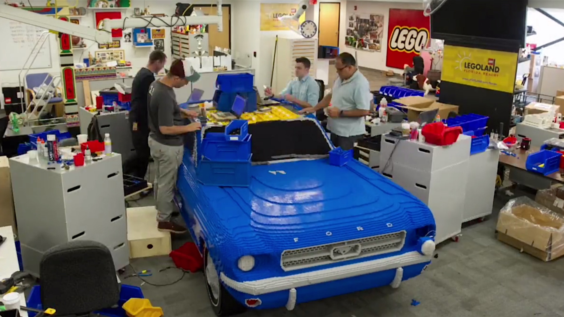 In the video we’ve embedded below, you can watch the entire Lego Mustang come to life. All the builders huddled in a small room pouring glue and placing blocks—it’s basically what I imagine Santa’s Christmas toy-building shop would be like. But, ya know, with a big blue Lego Mustang in the center.