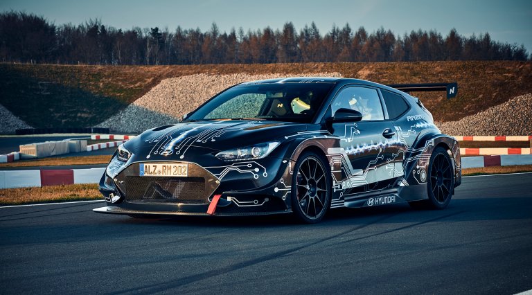 Those wheels are 21-inch rollers shod in 275/35 Pirelli P-Zero tires, which Hyundai claims to help the new N EV stick like glue on tracks like the Nürburgring. While the bulk of braking duty is handled by the electric motors’ regen settings, the car still makes use of 15.7-inch front rotors with four-piston calipers and 14.2-inch rears. According to David Beard at Car and Driver, one of the few folks outside of Hyundai who have driven this car so far, it’s plenty capable of stopping in a hurry: “Throughout four flying laps [of the Nürburgring GP circuit], the brakes never relinquish stopping force, and the pedal remains firm and tidy.”