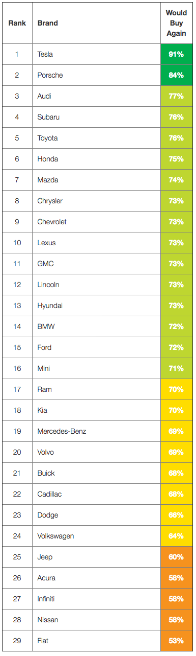 Second place Porsche, with 84% of owners stating they would buy another, makes incredible cars, demonstrating that you can build overwhelming loyalty despite a traditional sales and service experience.