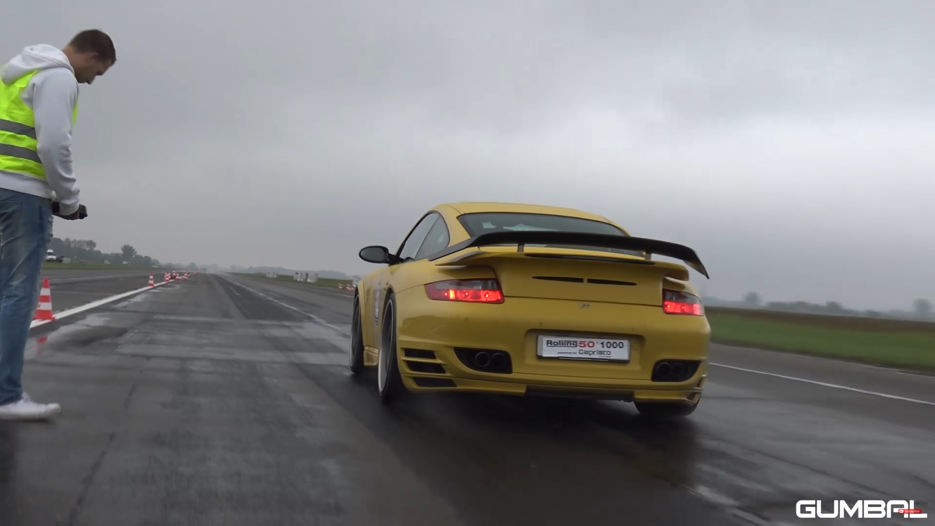 If you’ve ever been running late for work in your 997 Turbo and thought to yourself “You know, this doesn’t have nearly enough power!“, then perhaps German tuning company 9ff has the right stuff to build you the car you really need. The car in this video is claimed to have 1,070 horsepower, and it sure shoves off like it might. This particular brand of racing is called “Roll Racing” where you gently accelerate up to 50 (in this case I believe that is KPH) and when you get to a certain demarcation line you hammer the throttle wide open and see how fast you can cross the timing line a kilometer or so away. There is surprisingly little information about this car, but the video comments claim it has a sequential gearbox (it sure doesn’t sound like it), and a body kit from speedART.