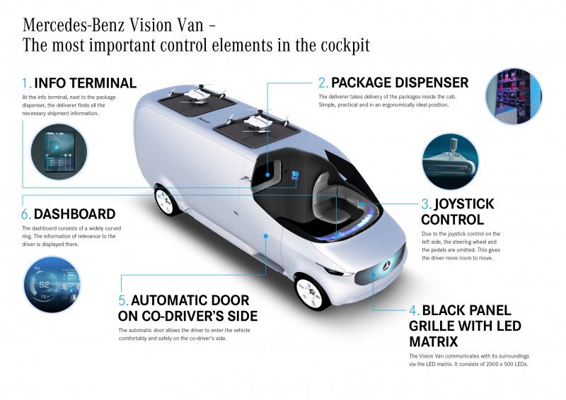 Many components and materials of the Vision Van are a bit too complex and futuristic to see the light of day, said a Mercedes-Benz engineer who spearheaded the project—which means UPS drivers can keep their brown uniforms for a little while longer. But some core elements of the study will eventually make its way into a production vehicle.