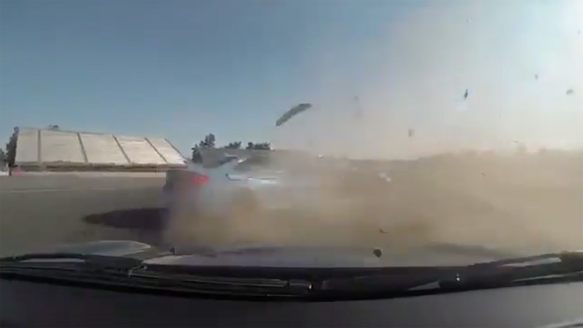 In a video posted by Camus Daniel, you can see several BMW M3s barrel down the front straight before coming to a sharp corner. Unfortunately the operator of a blue M3 sedan come out of nowhere and absolutely obliterate the rear passenger side of a black BMW M3 coupe. Both cars go careening off the track in a plume of smoke, shrapnel and twisted Bavarian metal.
