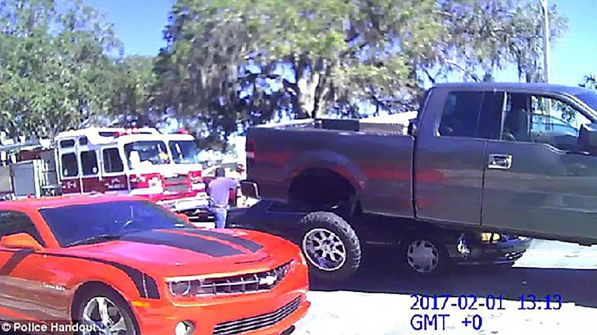 Aponte then pivoted and began to return to his car, according to police, possibly to retrieve said item from his vehicle. Unable to proceed forward due to cross traffic, Waring stated he felt stuck, and determined the only solution was to prevent Aponte from entering his car by driving his jacked-up F-150 onto the hood of the Camry. Waring’s actions proved to be effective and Aponte was reportedly unable to continue his attack.