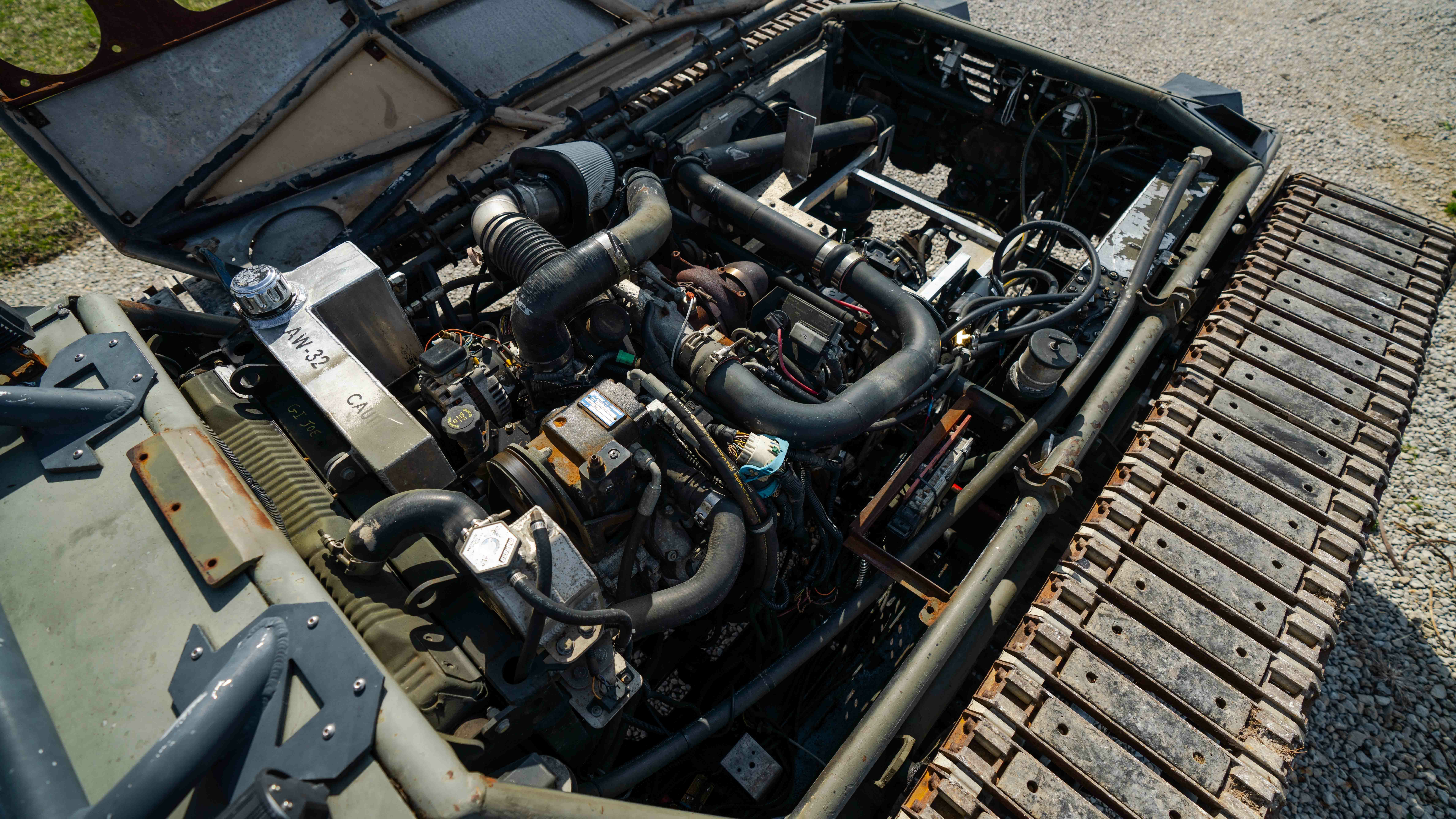It bears noting that this Ripsaw is a relatively spartan affair. There’s a pair of barebones racing seats and harnesses, along with some switches and loose wiring to handle starting and running the engine. Steering is via a crude yoke, with a go pedal mounted inside on the frame. It’s fitted with an automatic Allison transmission, which eases the driving experience to a degree.