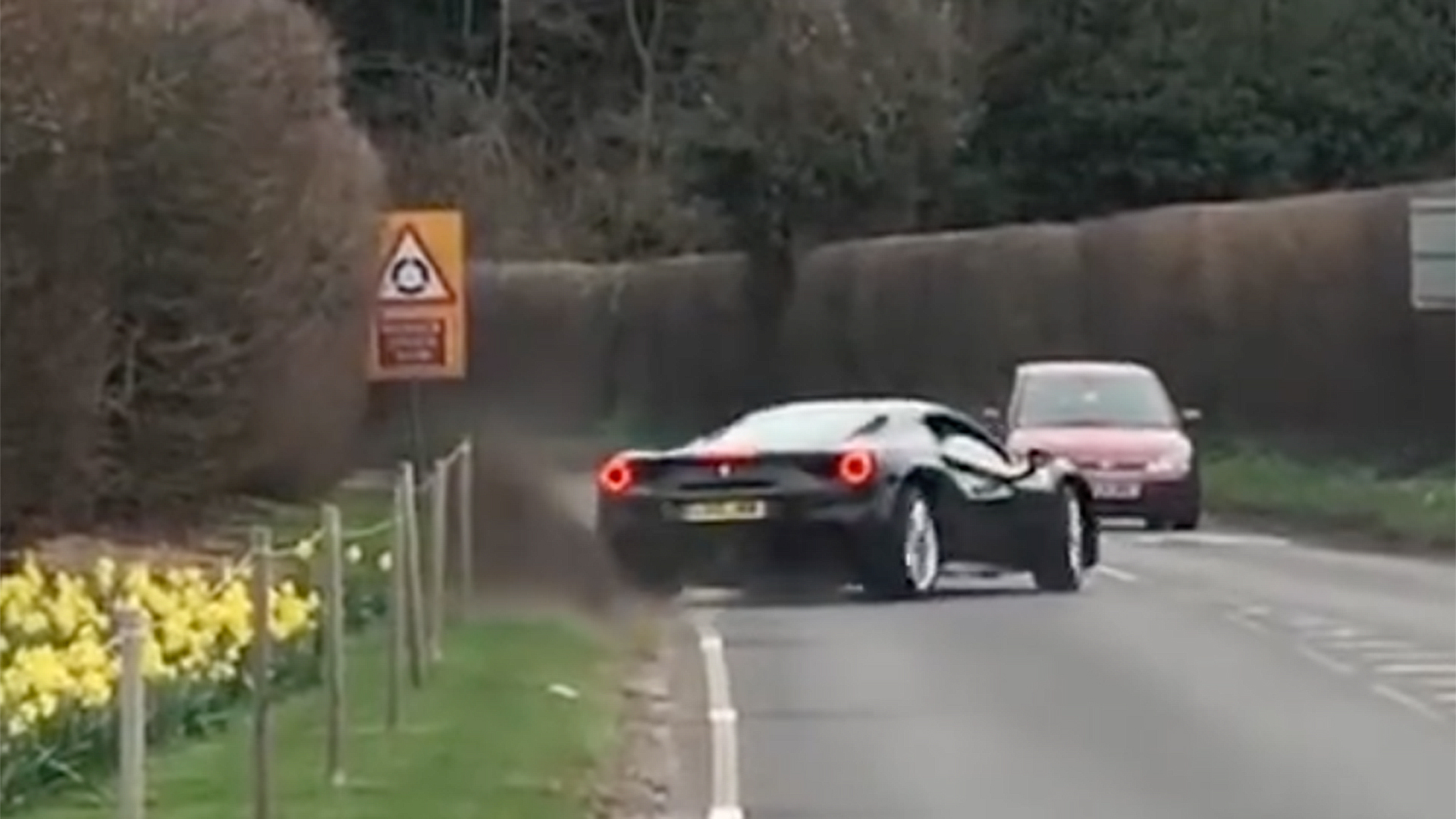 Today’s case in point: this 661-horsepower Ferrari 488 GTB, which lost control coming out of a car meet in Goodwood, England and nearly took out an innocent car going the other way.