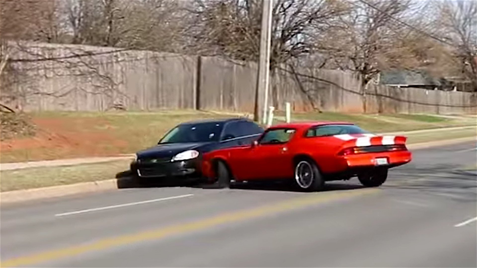 Videos uploaded to the internet over the past weekend show an orange second-generation Chevy Camaro pulling out from a parking lot with the driver losing control almost immediately. First, the Camaro aims itself toward a curb, then slaps back around and t-bones an oncoming Chevy Impala. According to a Facebook commenter and the YouTube videos, the incident occurred outside a Cars & Coffee event in Oklahoma City on Saturday.