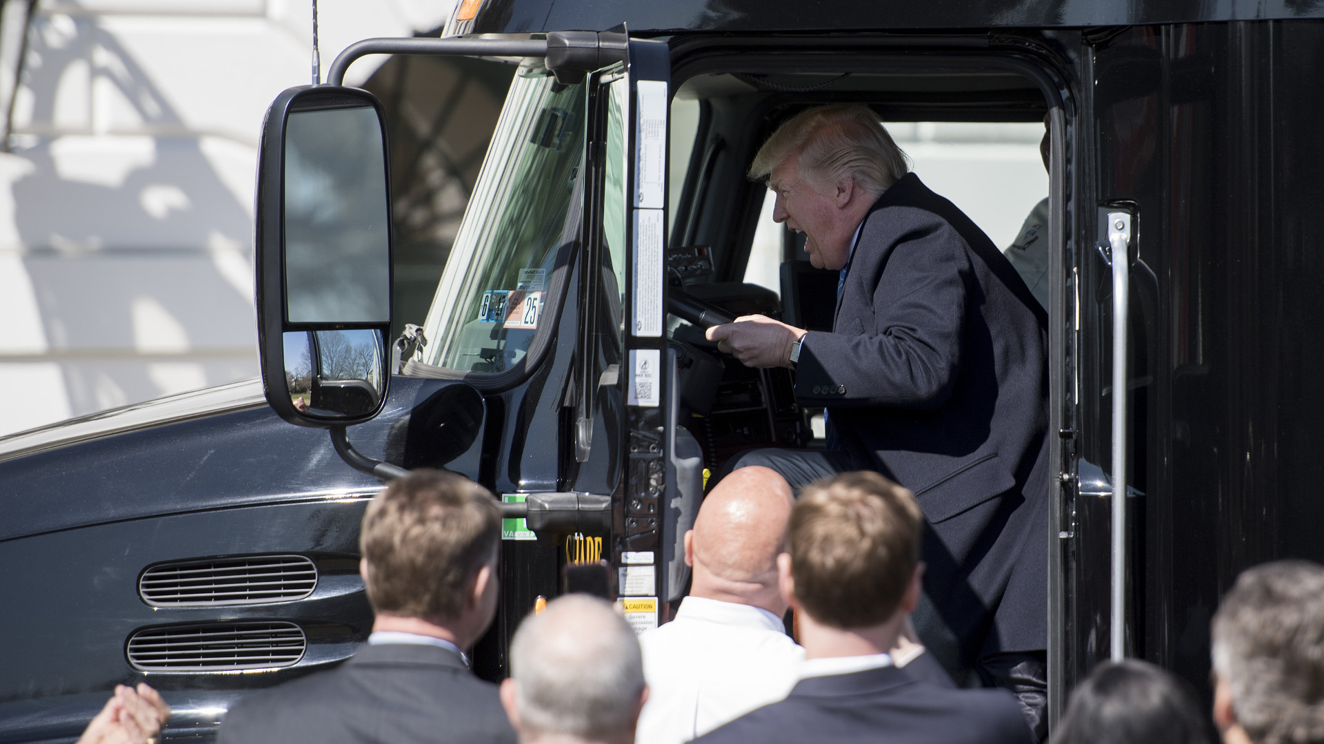 Along with the whole “leader of the free world” thing, being president also means sometimes putting up with a goofy situation. You can have the nuclear codes, but you still have to stand with a turkey on Thanksgiving, hug a giant creepy Easter Bunny each spring, and generally pose with every special guest that comes stomping through the White House. But when a group of truck drivers and trucking CEOs brought along a couple of their big toys to a meeting with President Donald Trump today, you just knew there would be some pretty choice shots coming out of the event.