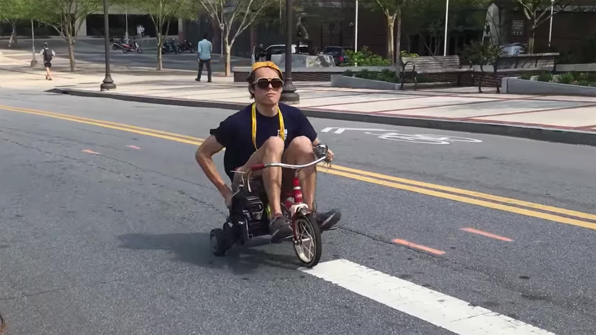 Anyways, the creative chaps decided to take a Radio Flyer trike and convert it into a chainsaw-driven “trikesaw.” After reinforcing the frame, welding on a drivetrain, making a mount for the engine, and attaching places for their feet, the inventors were ready to hit the main streets of the college.